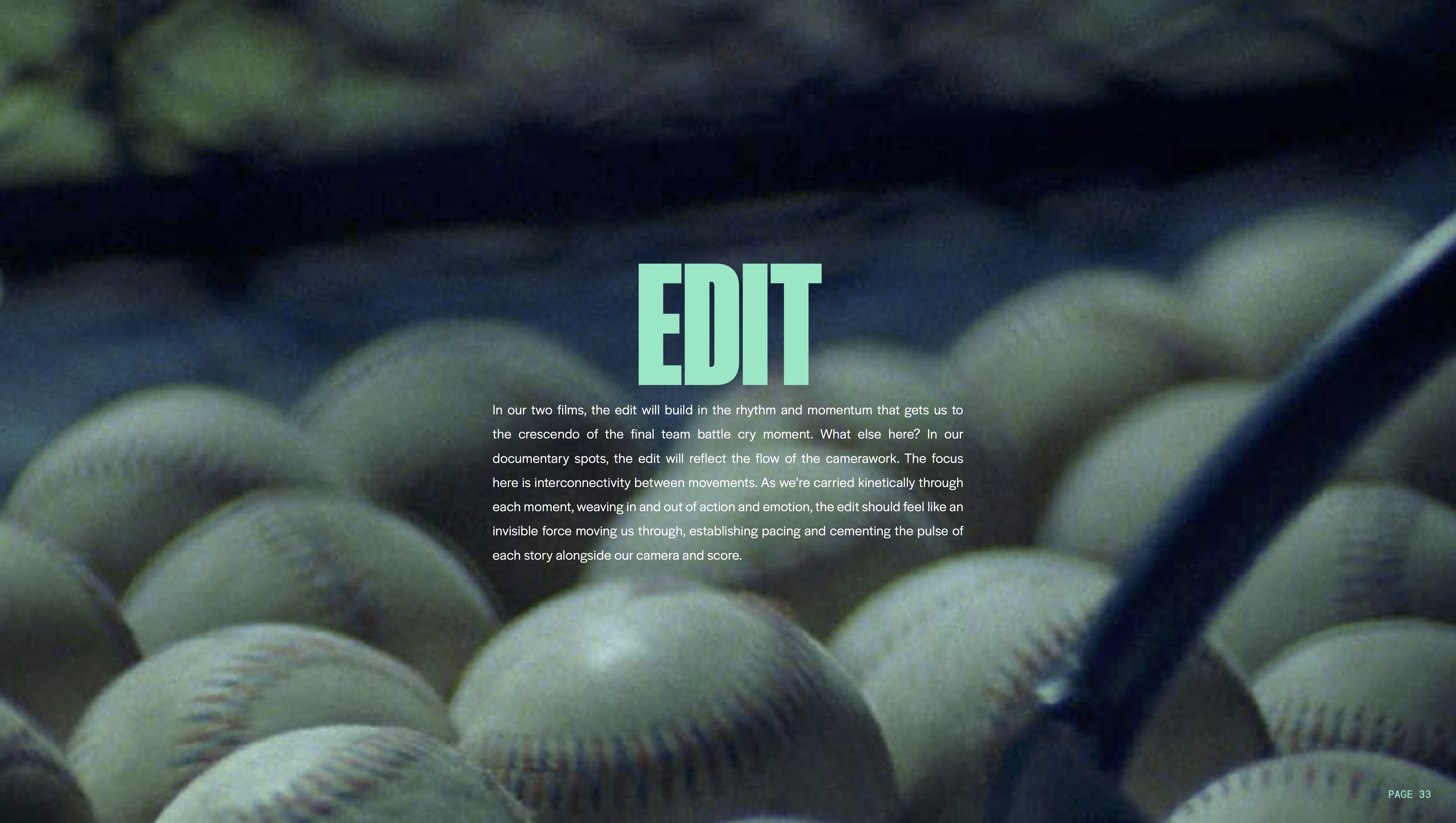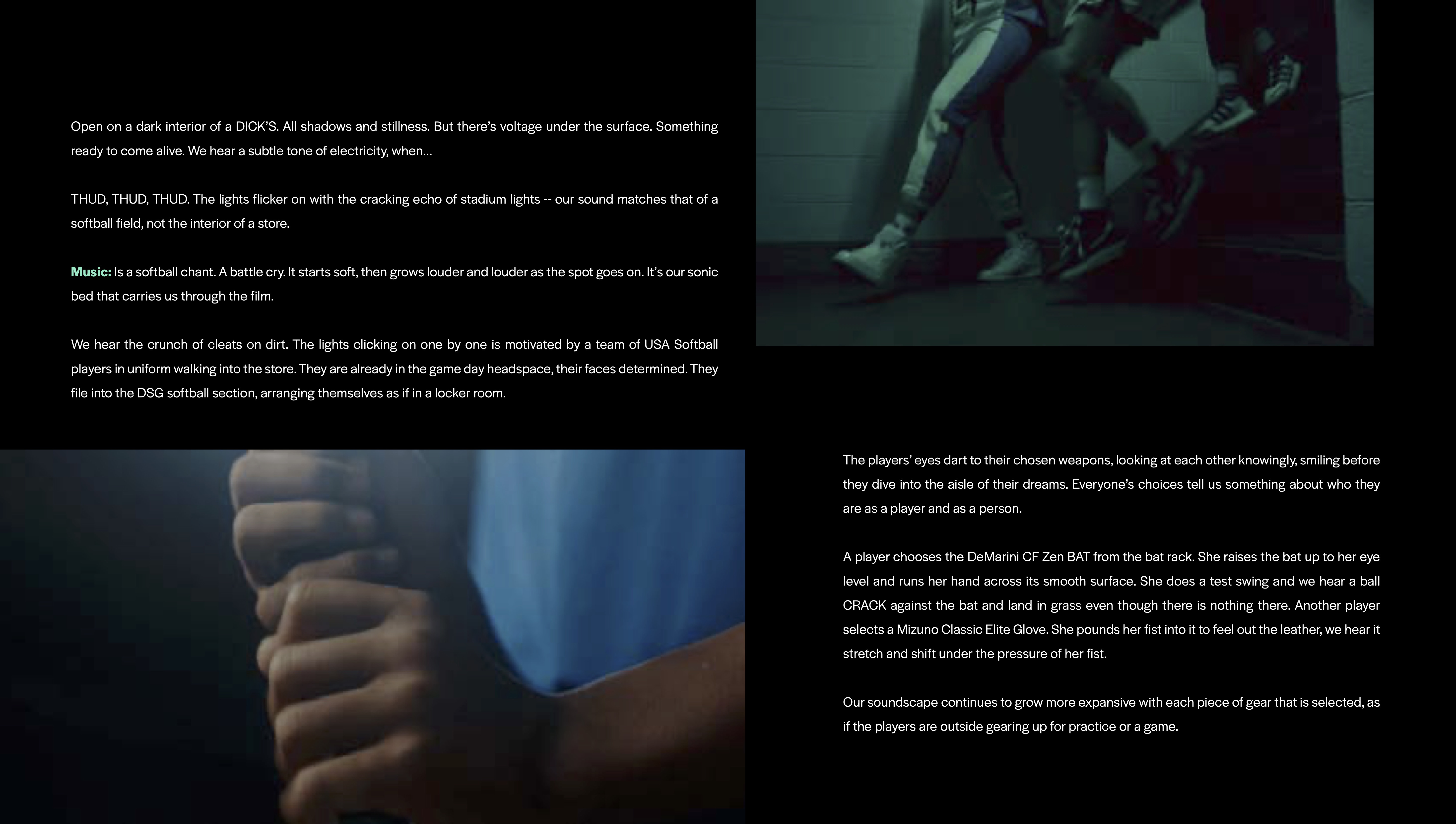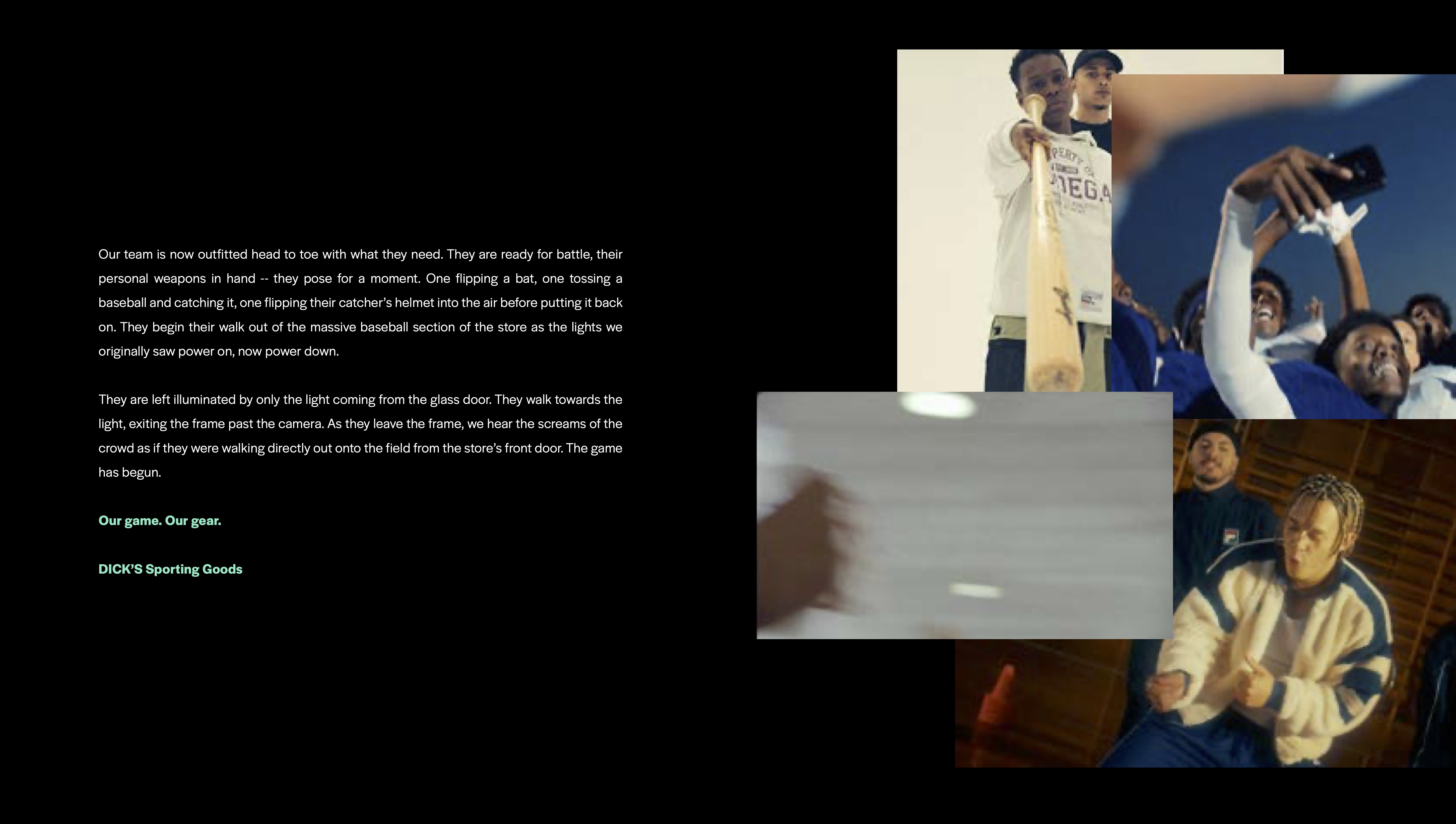 There’s a vivaciousness present in youth sports that is unlike anything else in the sports world. The marriage of discipline and physical mastery with the raw openness and play of teenagehood is a distinct combination, and its visceral energy is palpable to anyone who has ever attended a high school baseball game. Our experience working with real teen athletes in our sports documentary work has given us a shorthand around capturing this special blend of teen spirit and sports, and we’ll put this to use to tap into the genuine spirit of these baseball and softball teams. We’re excited about the possibility of combining the authentic edge of these young athletes with an artful and textural visual language to elevate these spots into a distinctly cinematic space that emphasizes how totally transformative the Dick’s store experience is to each of our players.