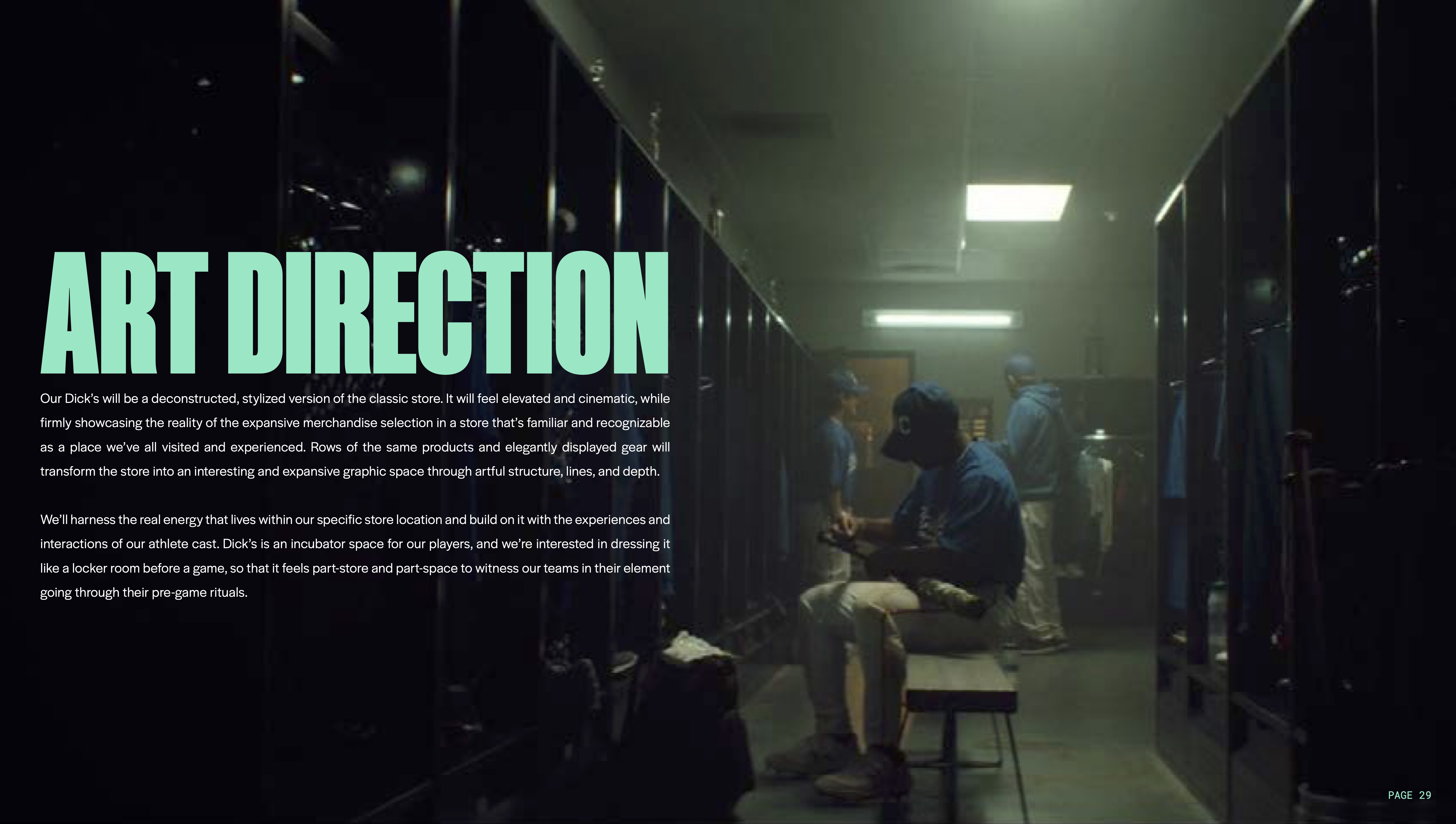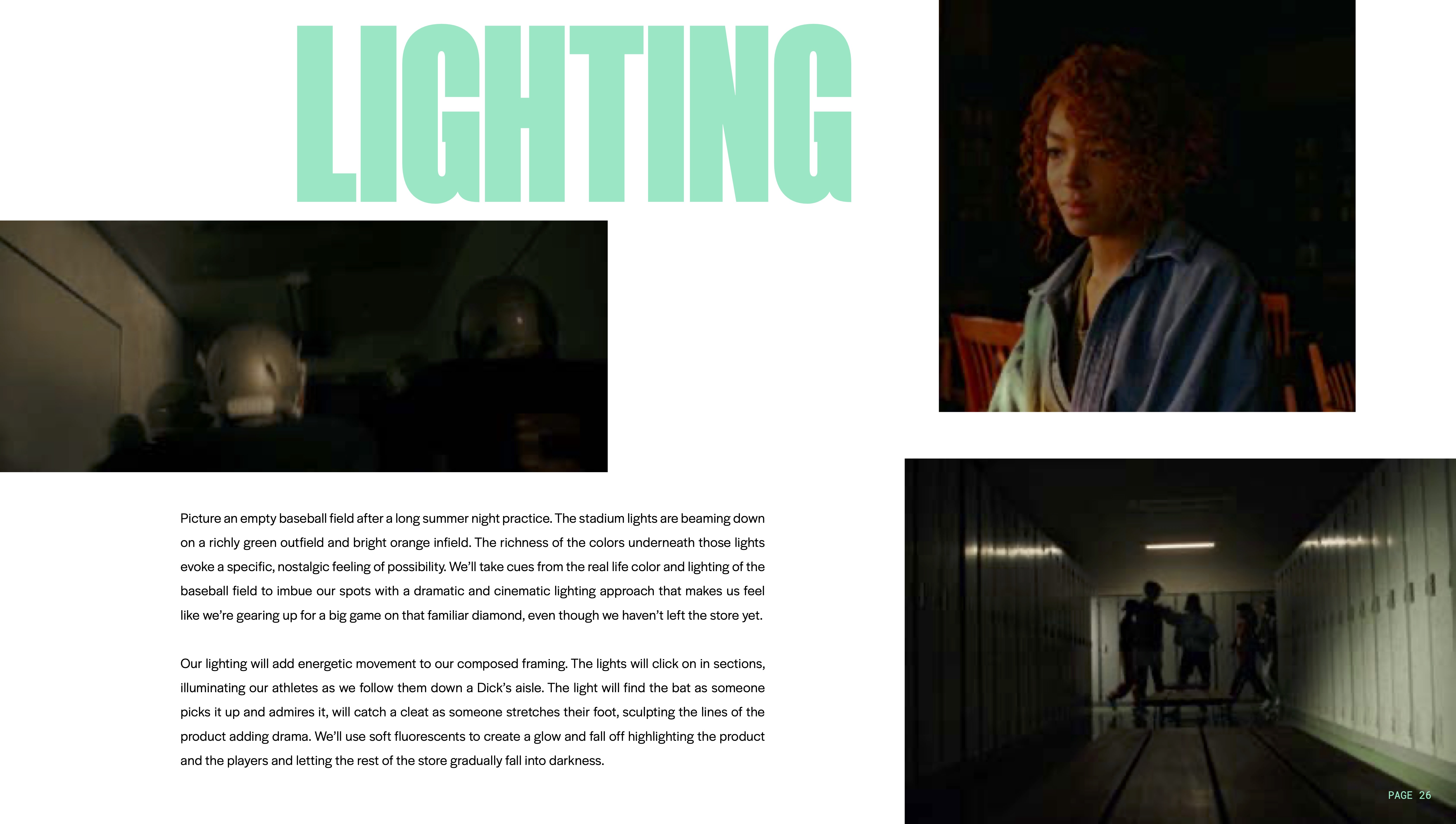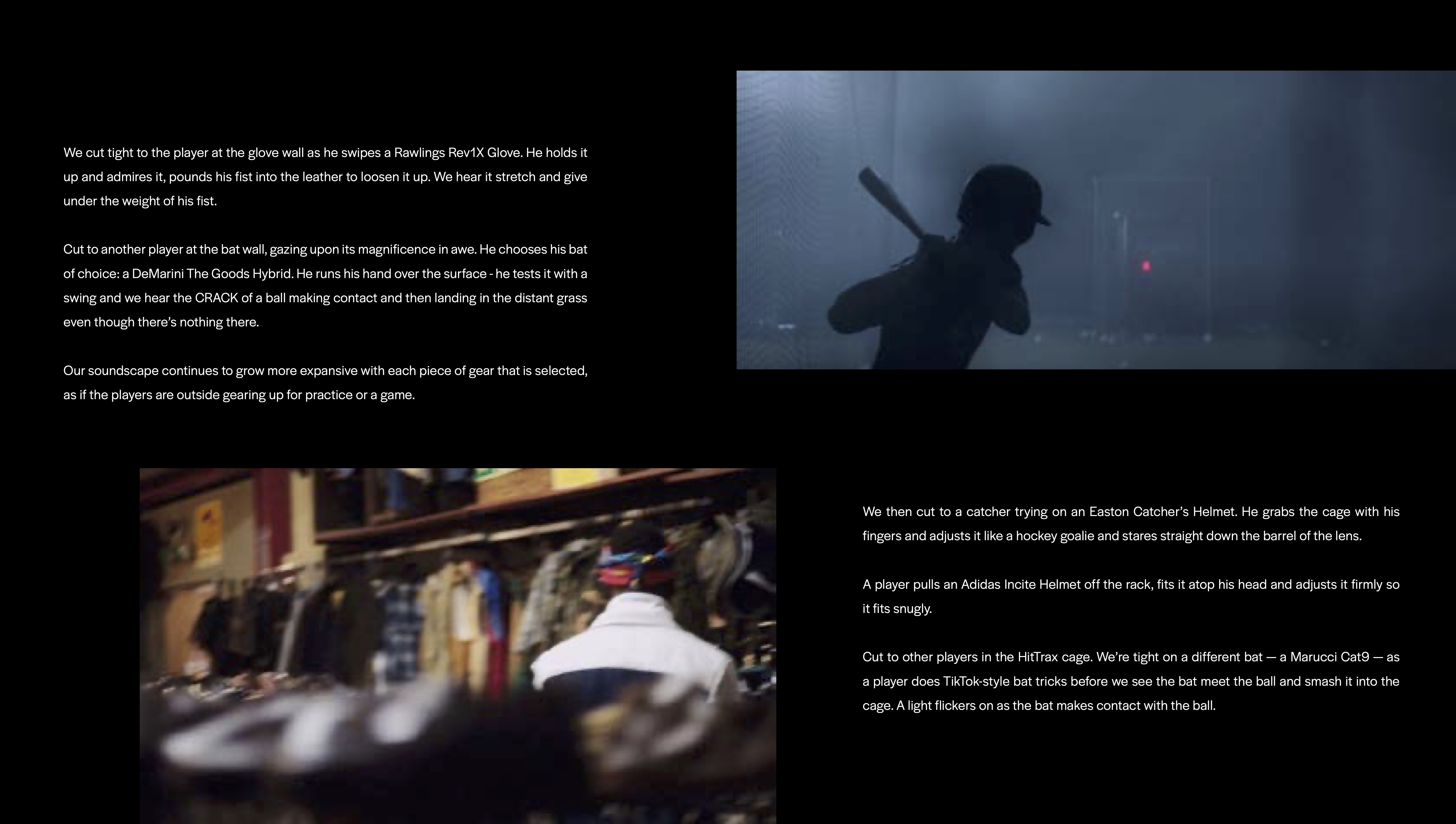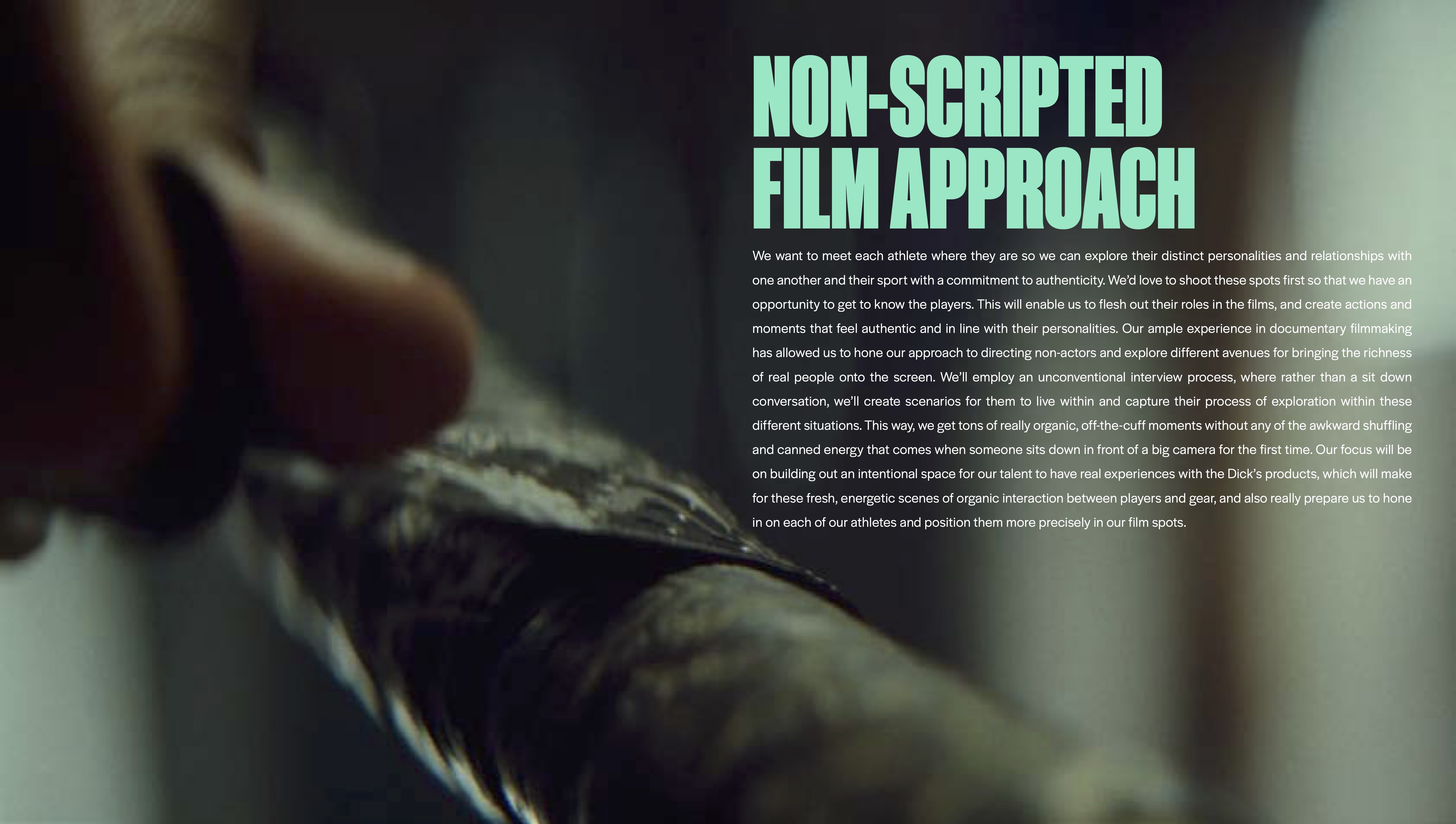 There’s a vivaciousness present in youth sports that is unlike anything else in the sports world. The marriage of discipline and physical mastery with the raw openness and play of teenagehood is a distinct combination, and its visceral energy is palpable to anyone who has ever attended a high school baseball game. Our experience working with real teen athletes in our sports documentary work has given us a shorthand around capturing this special blend of teen spirit and sports, and we’ll put this to use to tap into the genuine spirit of these baseball and softball teams. We’re excited about the possibility of combining the authentic edge of these young athletes with an artful and textural visual language to elevate these spots into a distinctly cinematic space that emphasizes how totally transformative the Dick’s store experience is to each of our players.