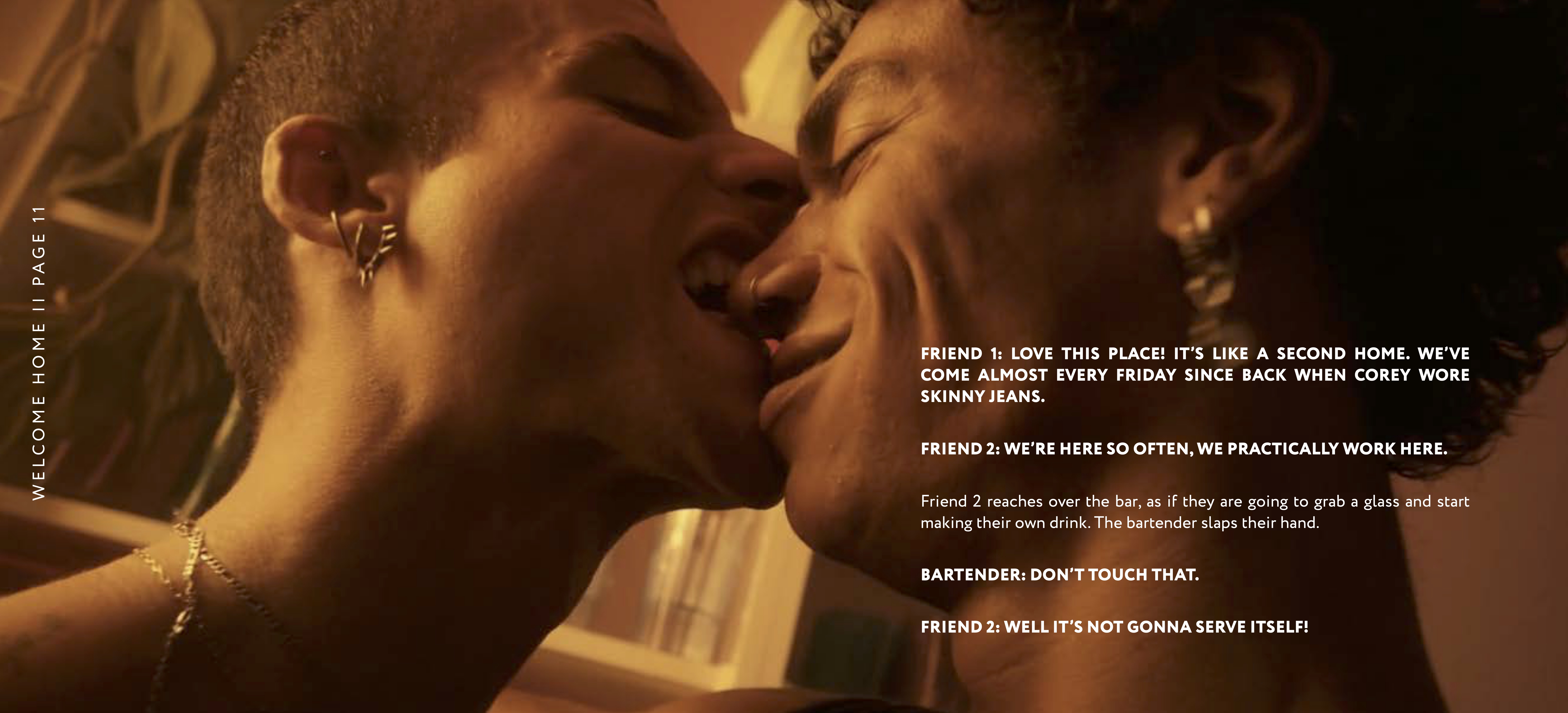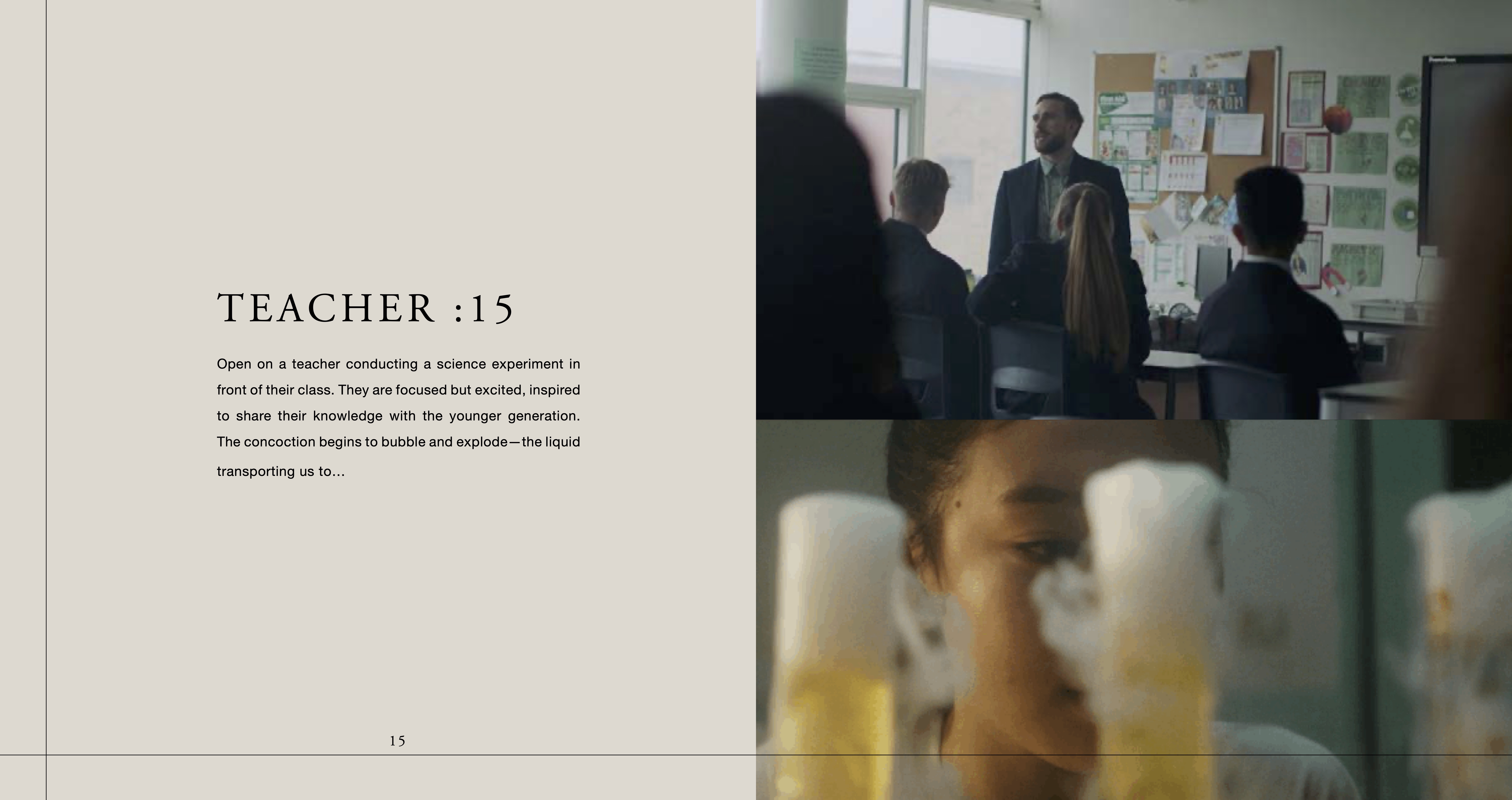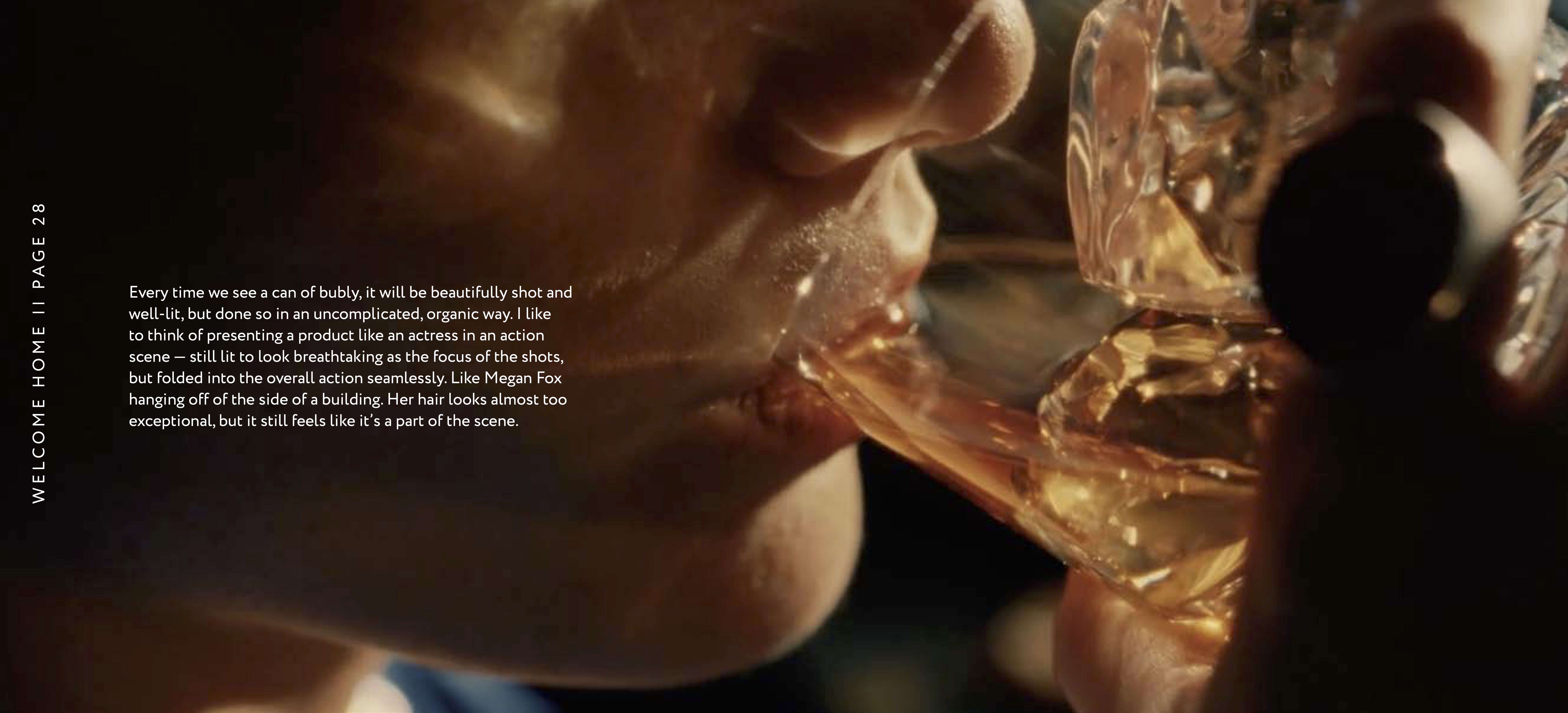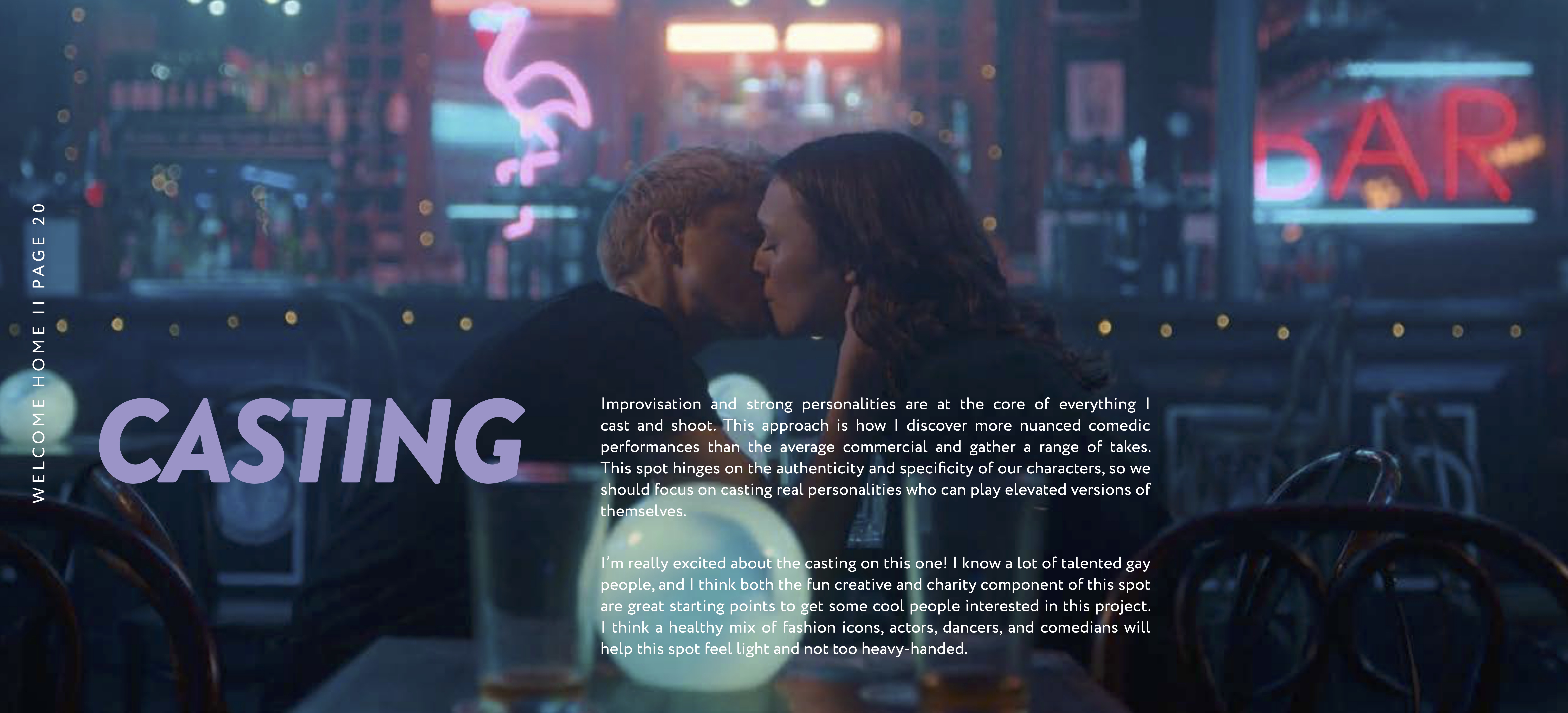 In the edit room, we will introduce the pacing that will bring home the humor and irreverence of this unique spot. I’ll shoot deliberately, so we can deliver a wide range of assets. My aim is to provide the editor with the puzzle pieces they need to build out the most joyful and funny moments, allowing them to communicate the playful spirit of the script - all while honouring the original flow of the script and therefore the physical flow we’ll build our path through the bar on. We should feel the energy and spontaneity of each moment between our characters really organically, as though we’ve just stumbled upon them, lucky to catch them before they slip away.