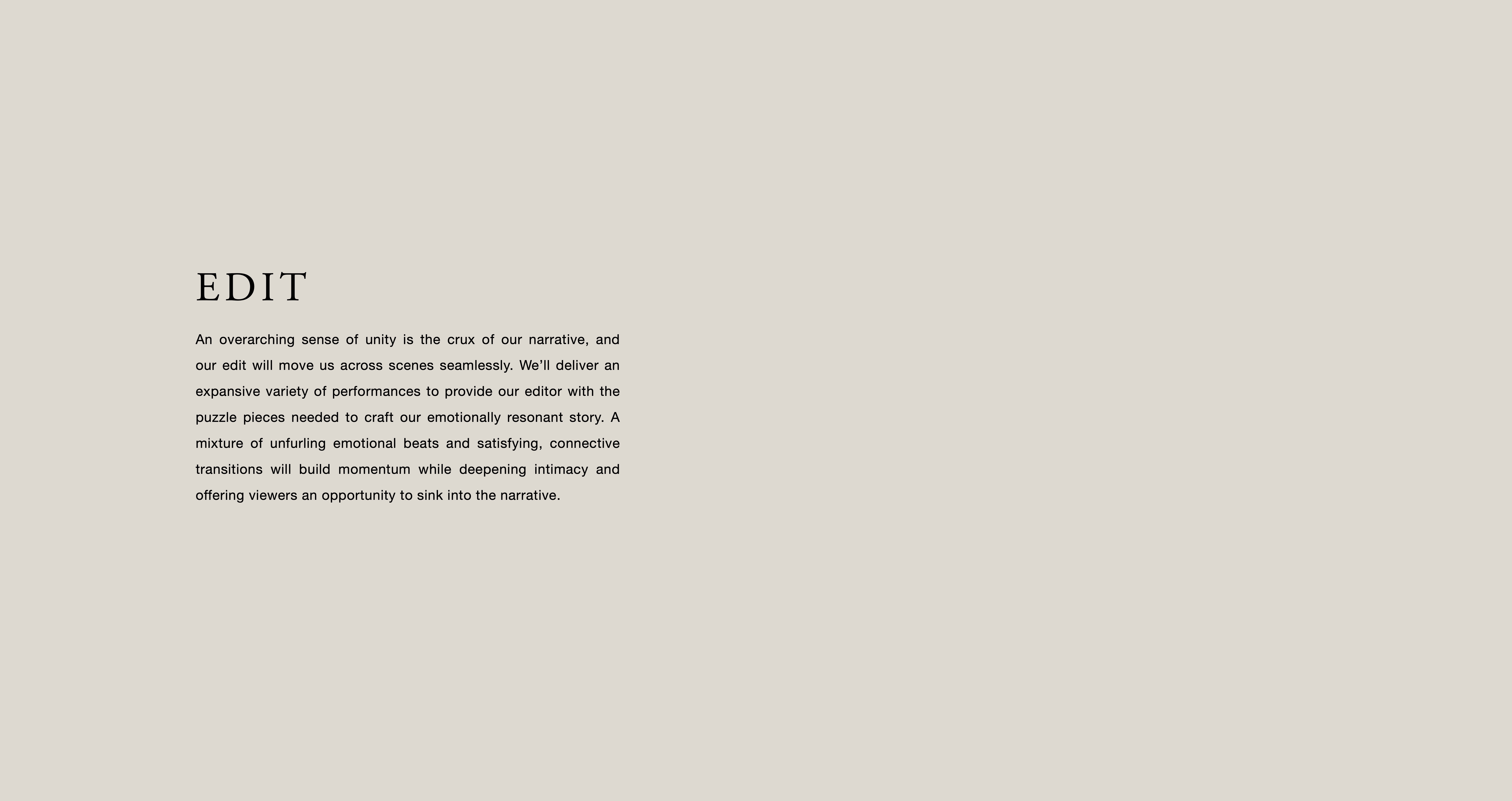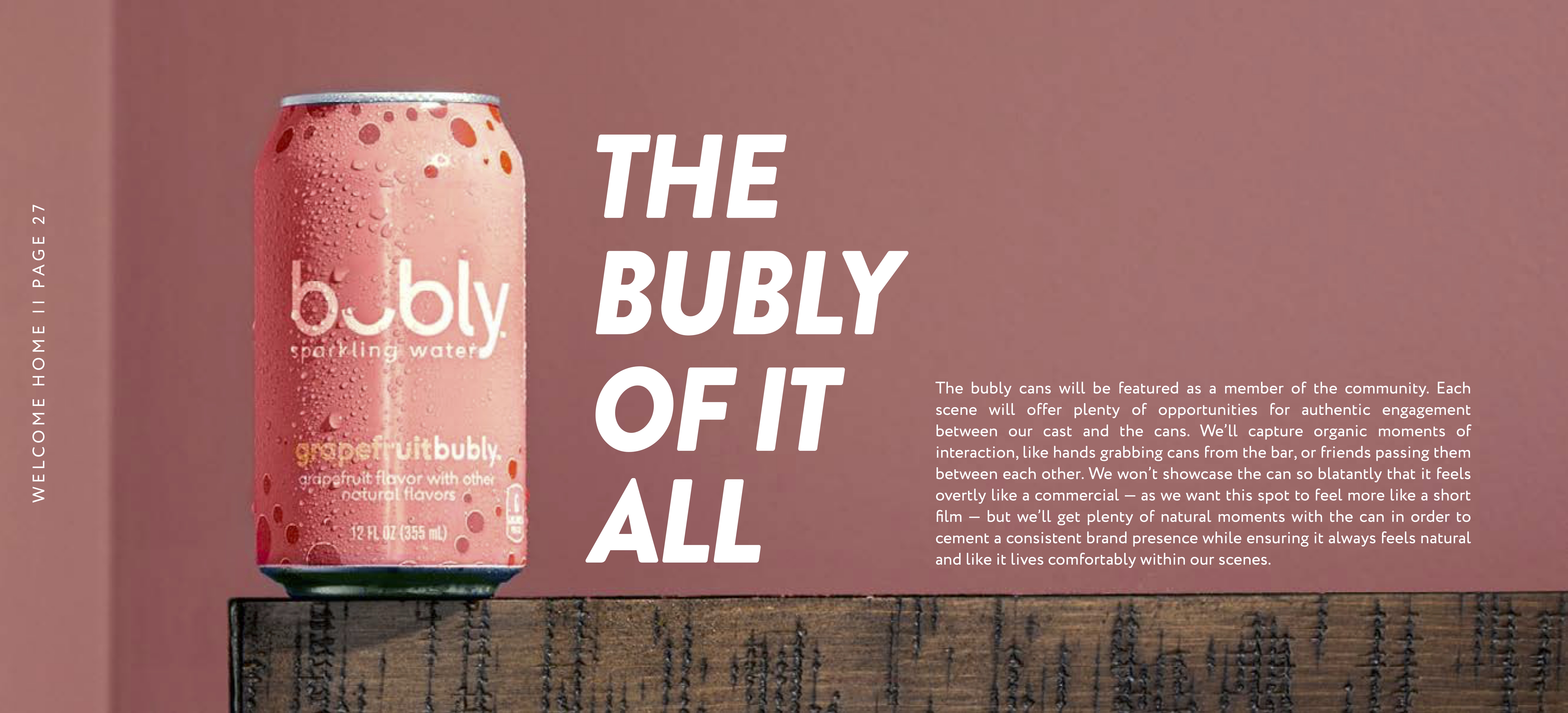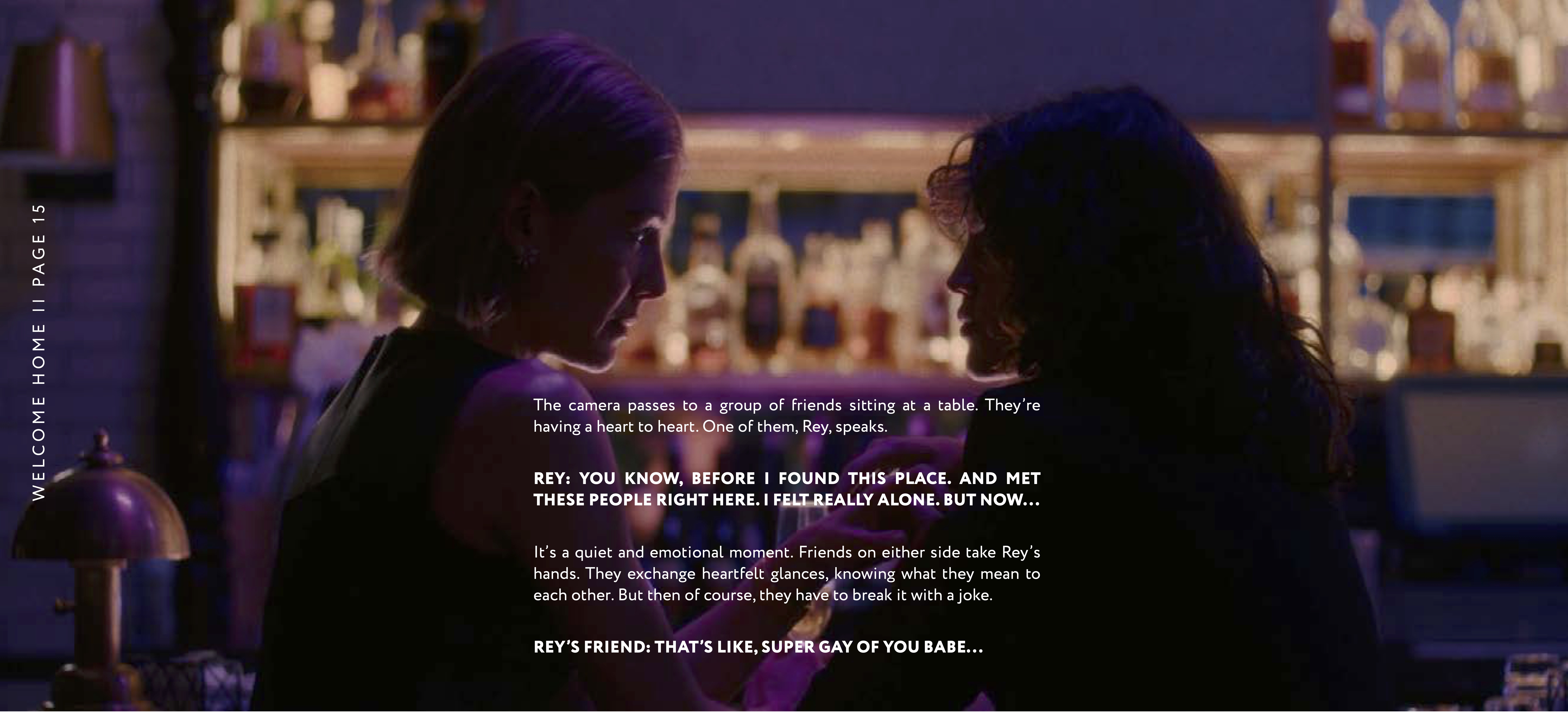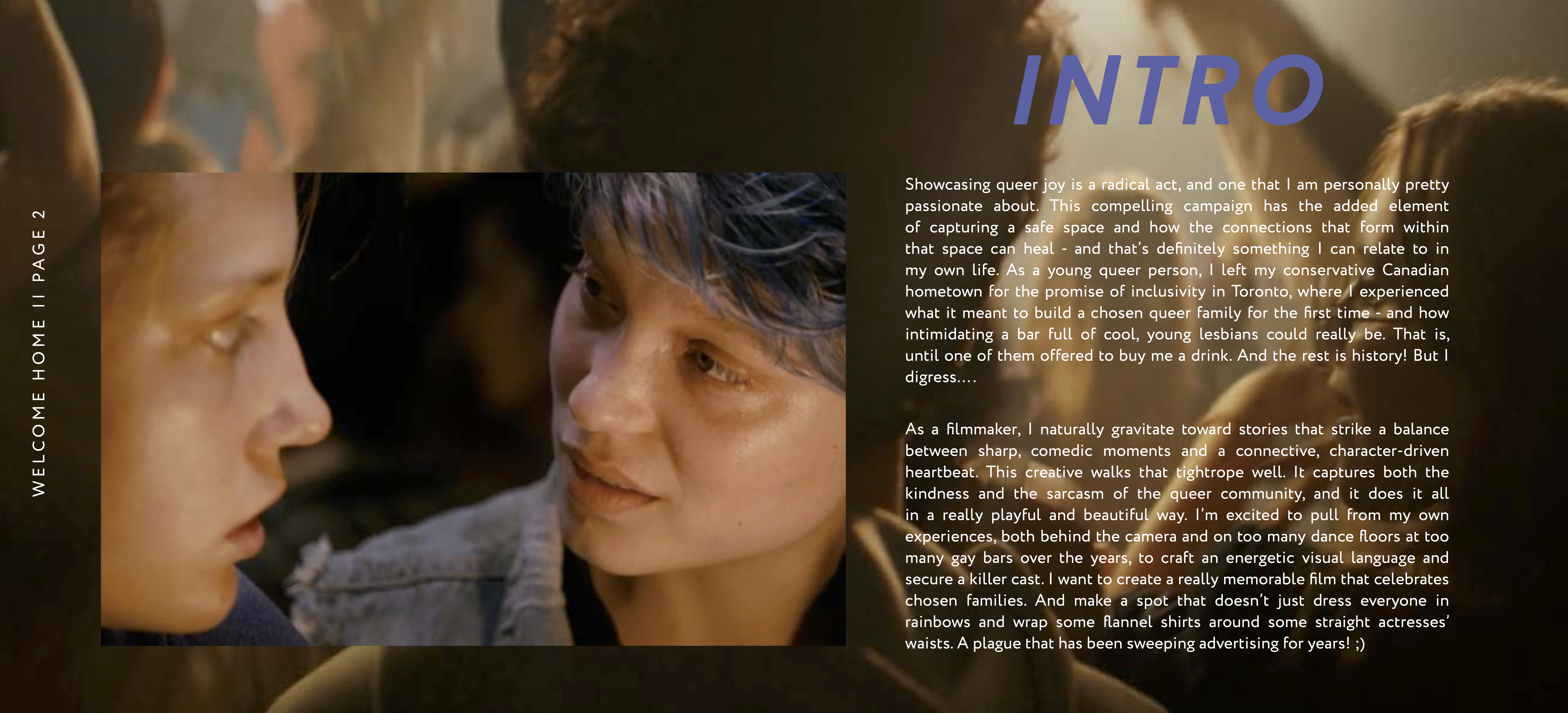 In the edit room, we will introduce the pacing that will bring home the humor and irreverence of this unique spot. I’ll shoot deliberately, so we can deliver a wide range of assets. My aim is to provide the editor with the puzzle pieces they need to build out the most joyful and funny moments, allowing them to communicate the playful spirit of the script - all while honouring the original flow of the script and therefore the physical flow we’ll build our path through the bar on. We should feel the energy and spontaneity of each moment between our characters really organically, as though we’ve just stumbled upon them, lucky to catch them before they slip away.