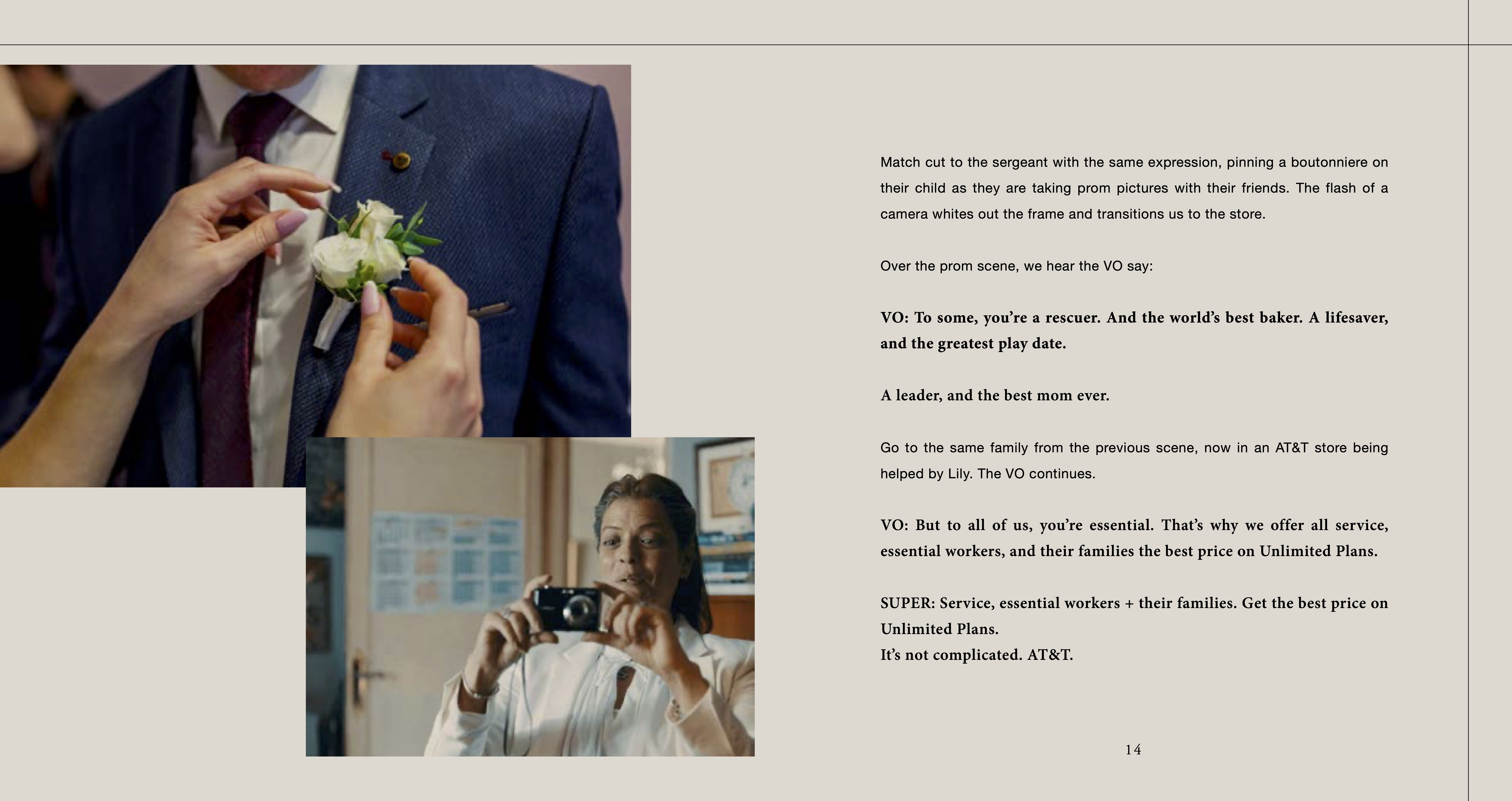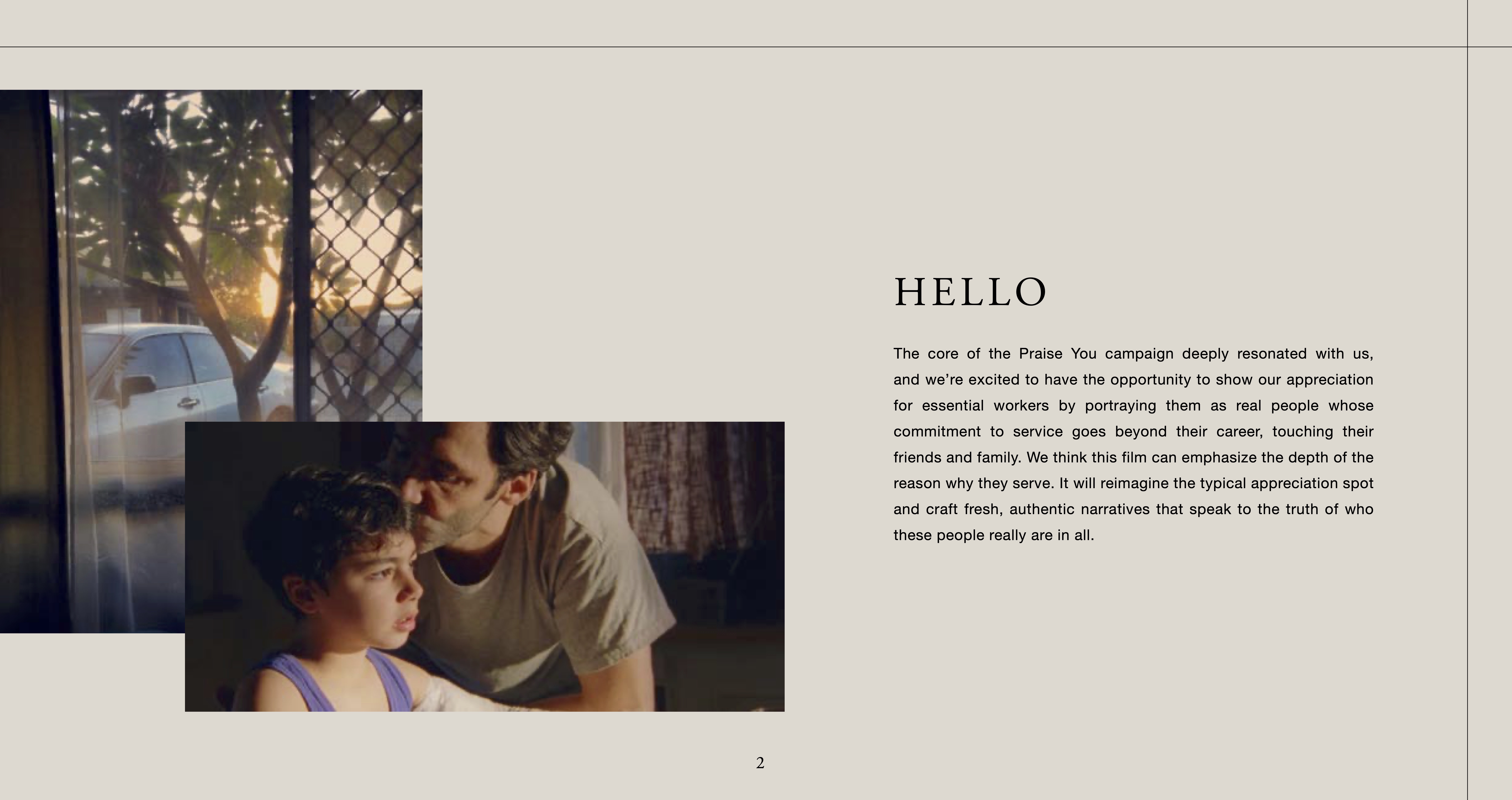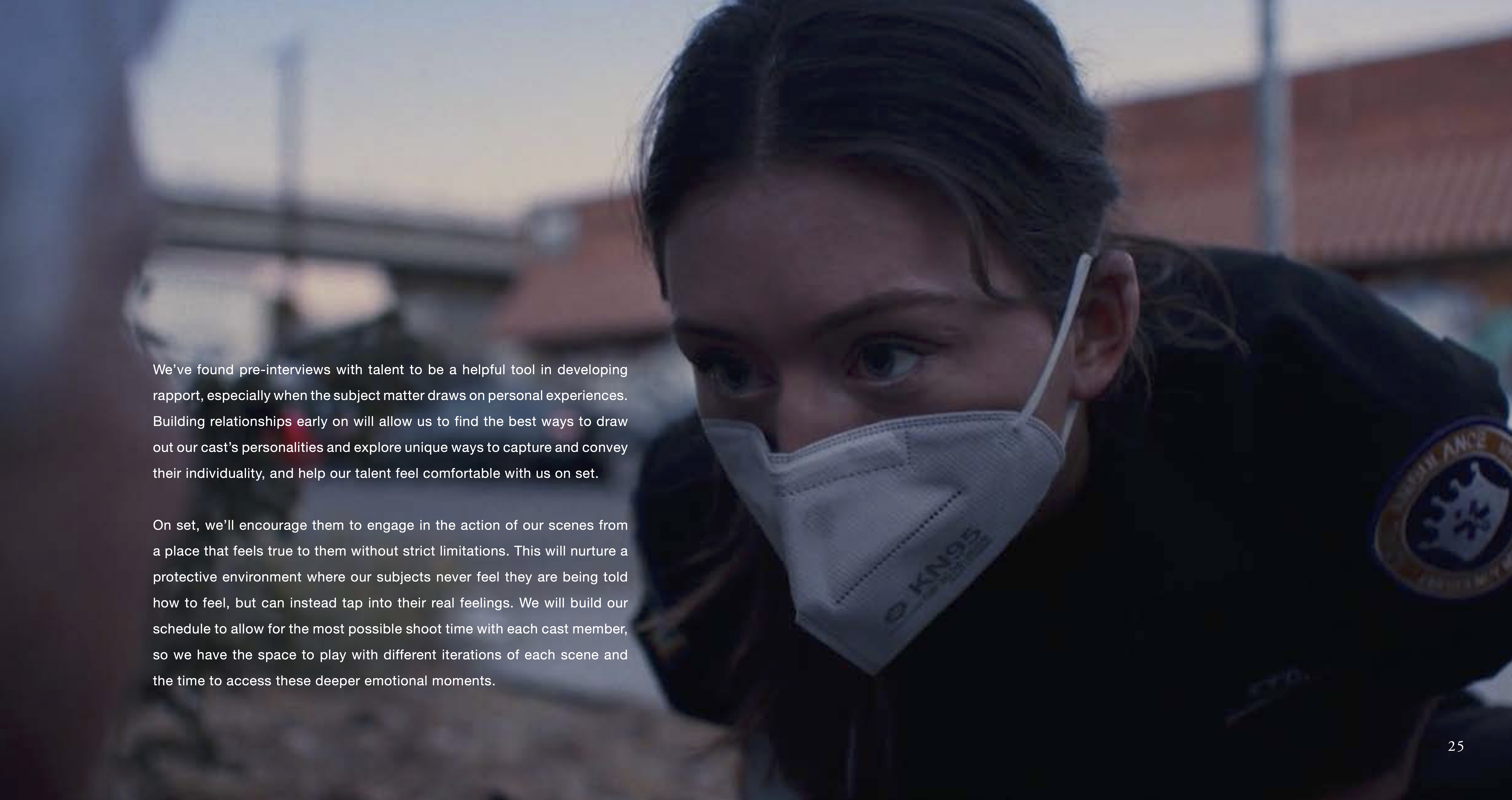 In order to ensure the viewer feels what it’s truly like to work tirelessly for the greater good at work and home, we will capture our subjects with a nuance and specificity that will evoke that truth. We’ll draw from tenets of documentary filmmaking and create a framework for our talent to explore the emotions of each scene with space to draw from their real experiences as inspiration for their performances. In order to ensure organic performances, we want our cast to have some experience in the roles they are playing. We’ll be open to their natural blocking or reactions, capturing their real vulnerability within each scripted beat. We’ll limit our crew in the room to create the sort of intimate creative environment that will allow our cast to feel comfortable to express themselves truthfully and give us those moments that will make these spots resonate. We’ll create a narrative that highlights the interconnectivity of the human experience. Our characters will feel like people we all know from our own communities, and as a result, our viewers will feel the impact their important work has on the fabric of society. This will spark viewers to relate to them on a human level, not just feel grateful for their service.