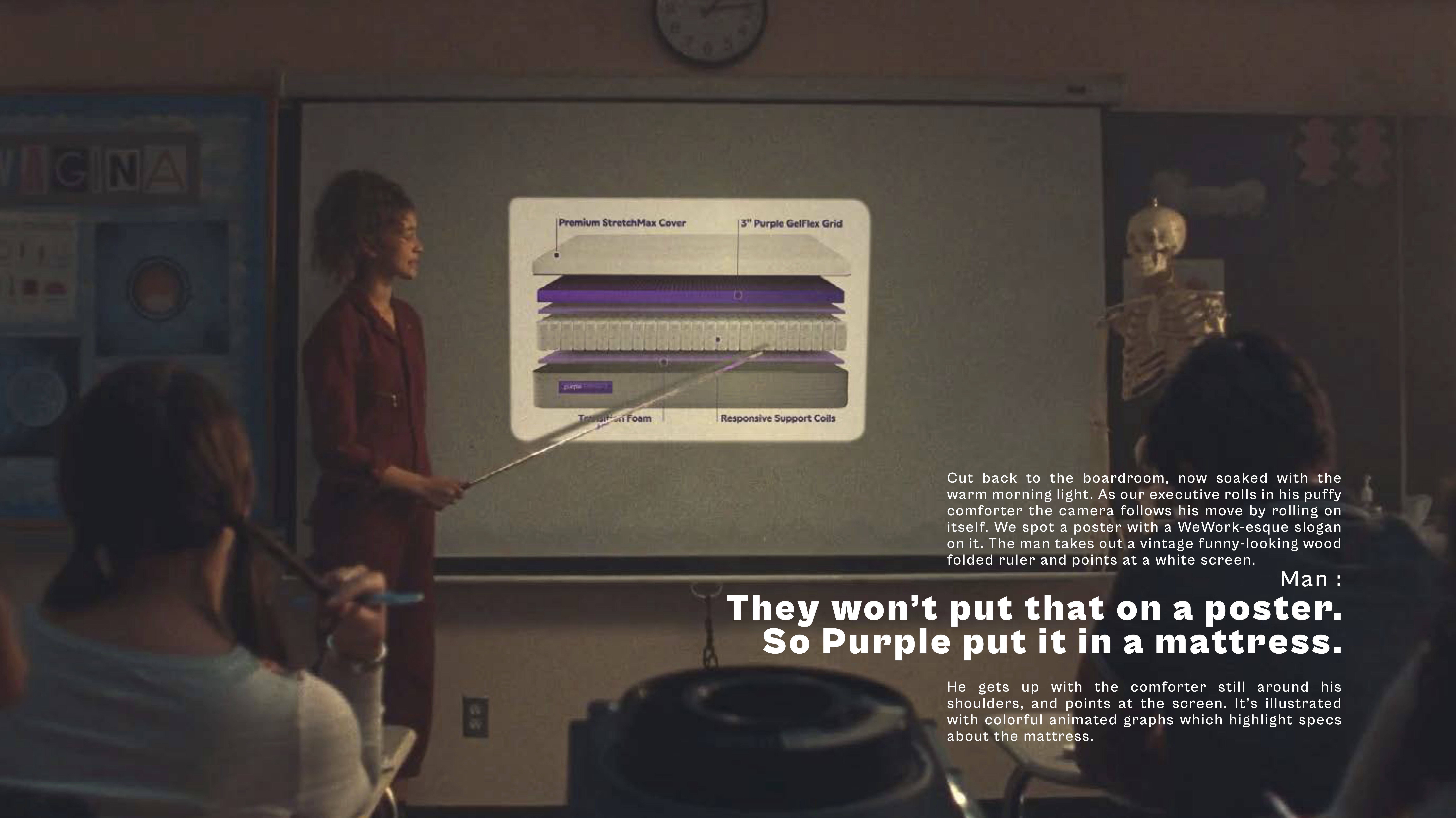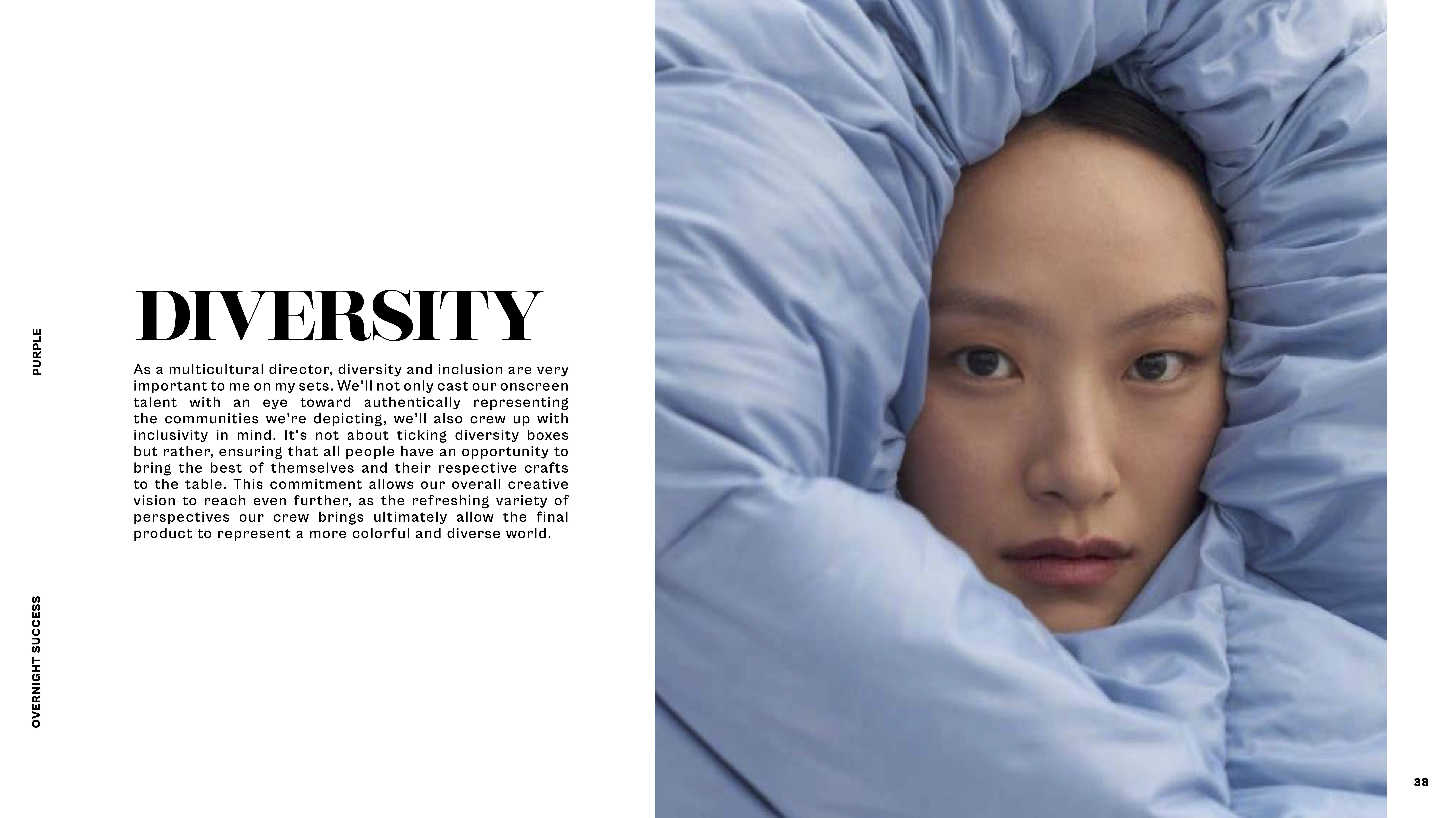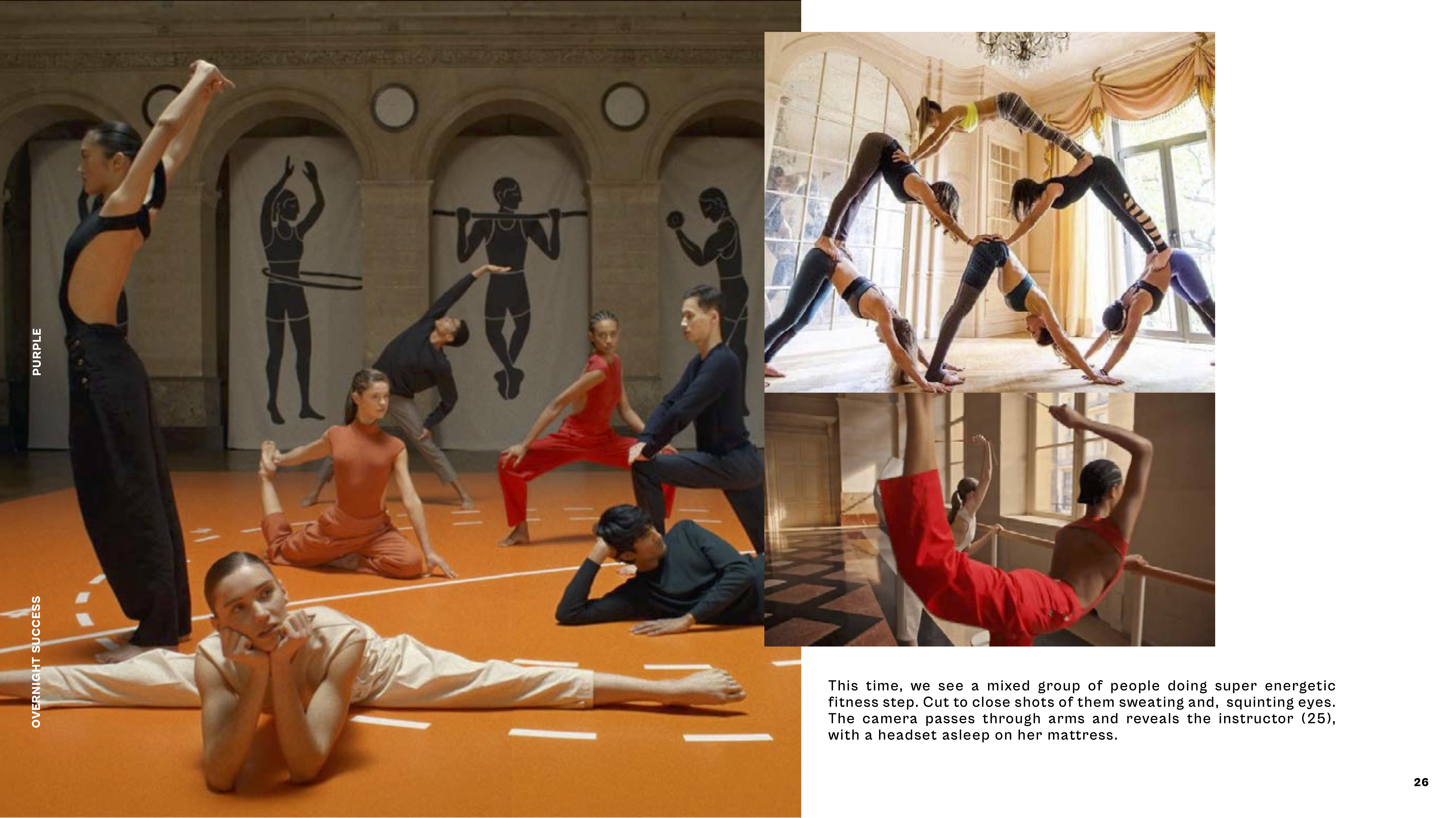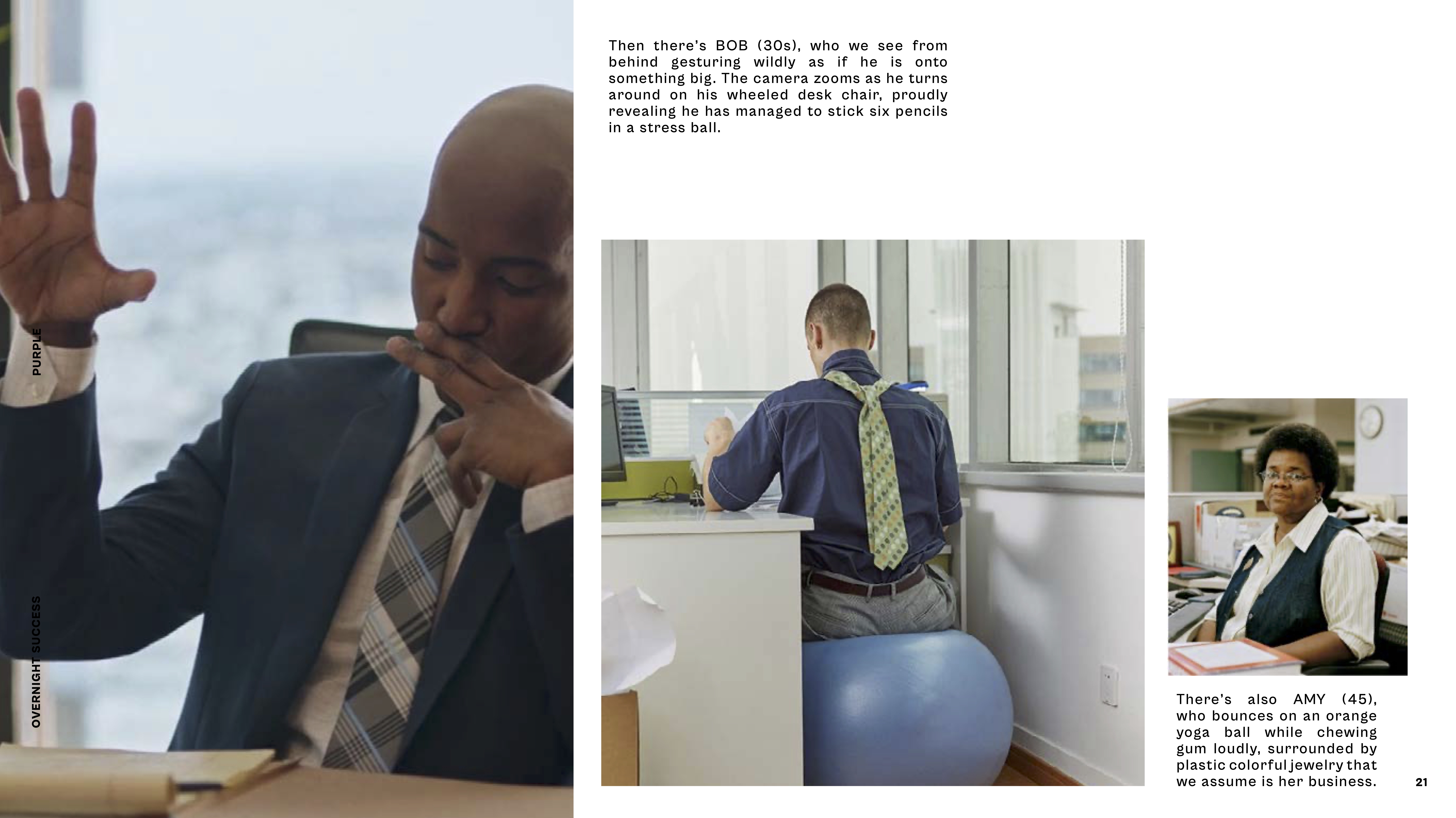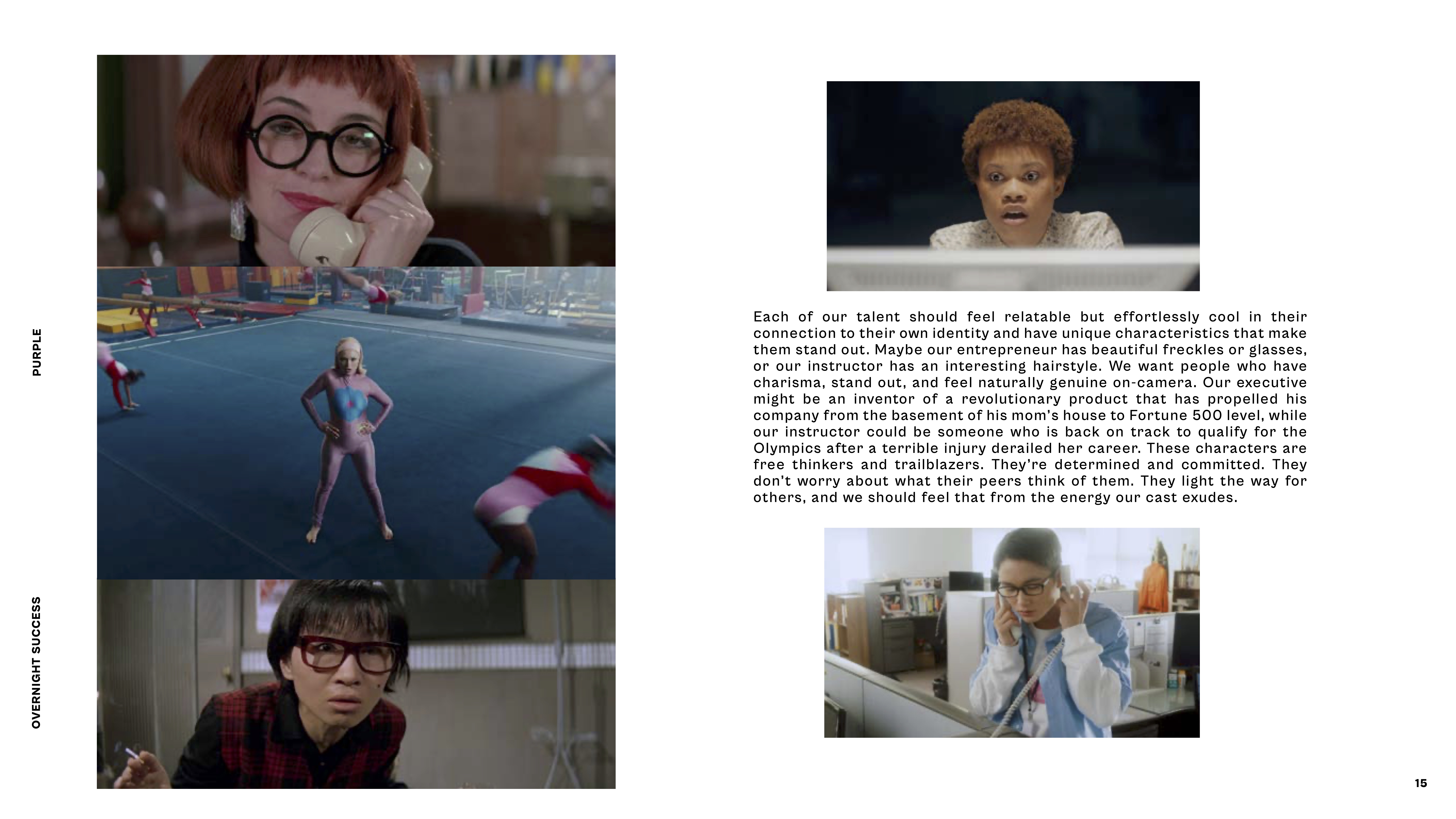 We want to capture our viewers immediately and hook them in with the authenticity and specificity of each character. We’ll do this through a killer cast of distinctive, memorable characters who can deliver captivating performances. Our cast should feel visually distinct and we will cast with attention to diversity of age, gender, and race to create an ensemble who reflect the real Purple market. Each of our talent should feel relatable but effortlessly cool in their connection to their own identity and have unique characteristics that make them stand out. Maybe our entrepreneur has beautiful freckles or glasses, or our instructor has an interesting hairstyle. We want people who have charisma, stand out, and feel naturally genuine on-camera. Our executive might be an inventor of a revolutionary product that has propelled his company from the basement of his mom’s house to Fortune 500 level, while our instructor could be someone who is back on track to qualify for the Olympics after a terrible injury derailed her career. These characters are free thinkers and trailblazers. They’re determined and committed. They don’t worry about what their peers think of them. They light the way for others, and we should feel that from the energy our cast exudes.