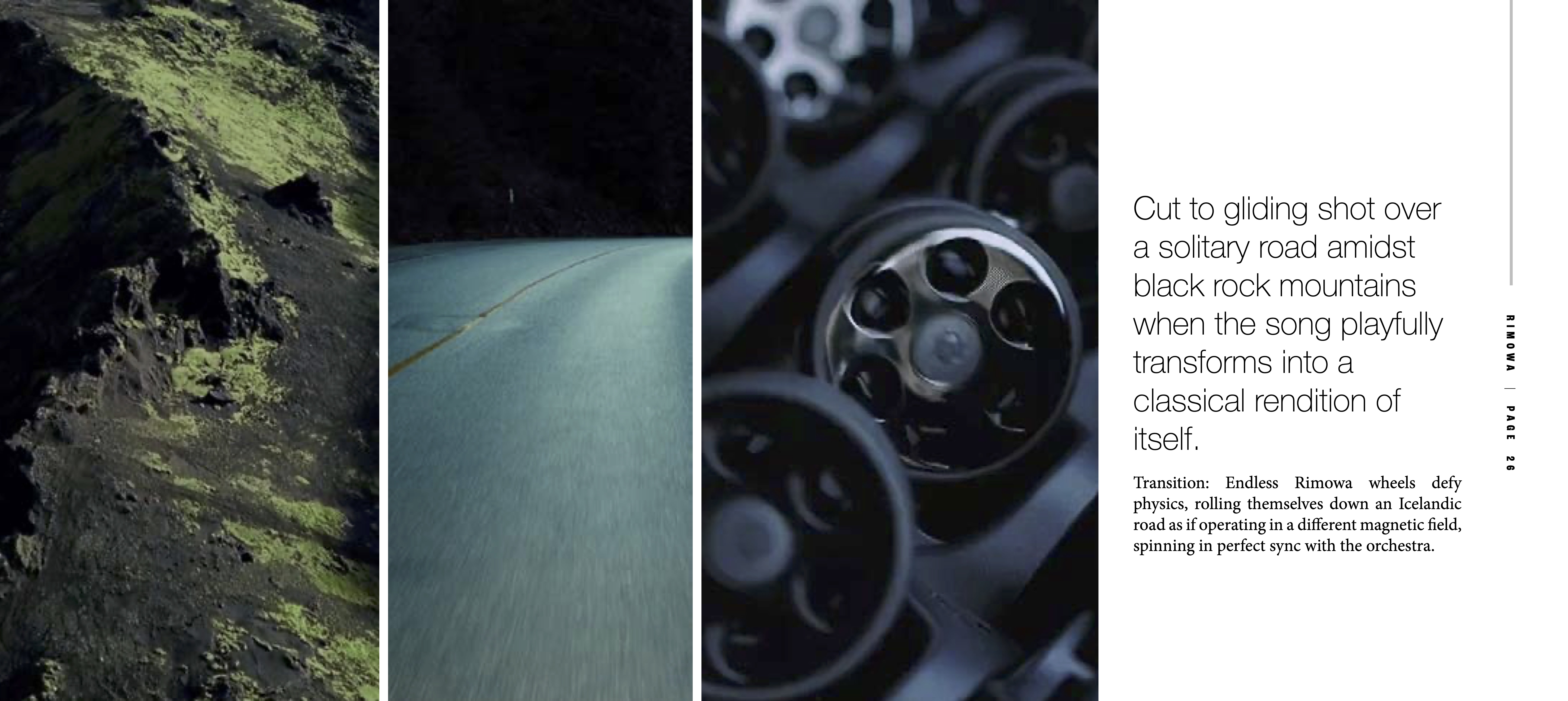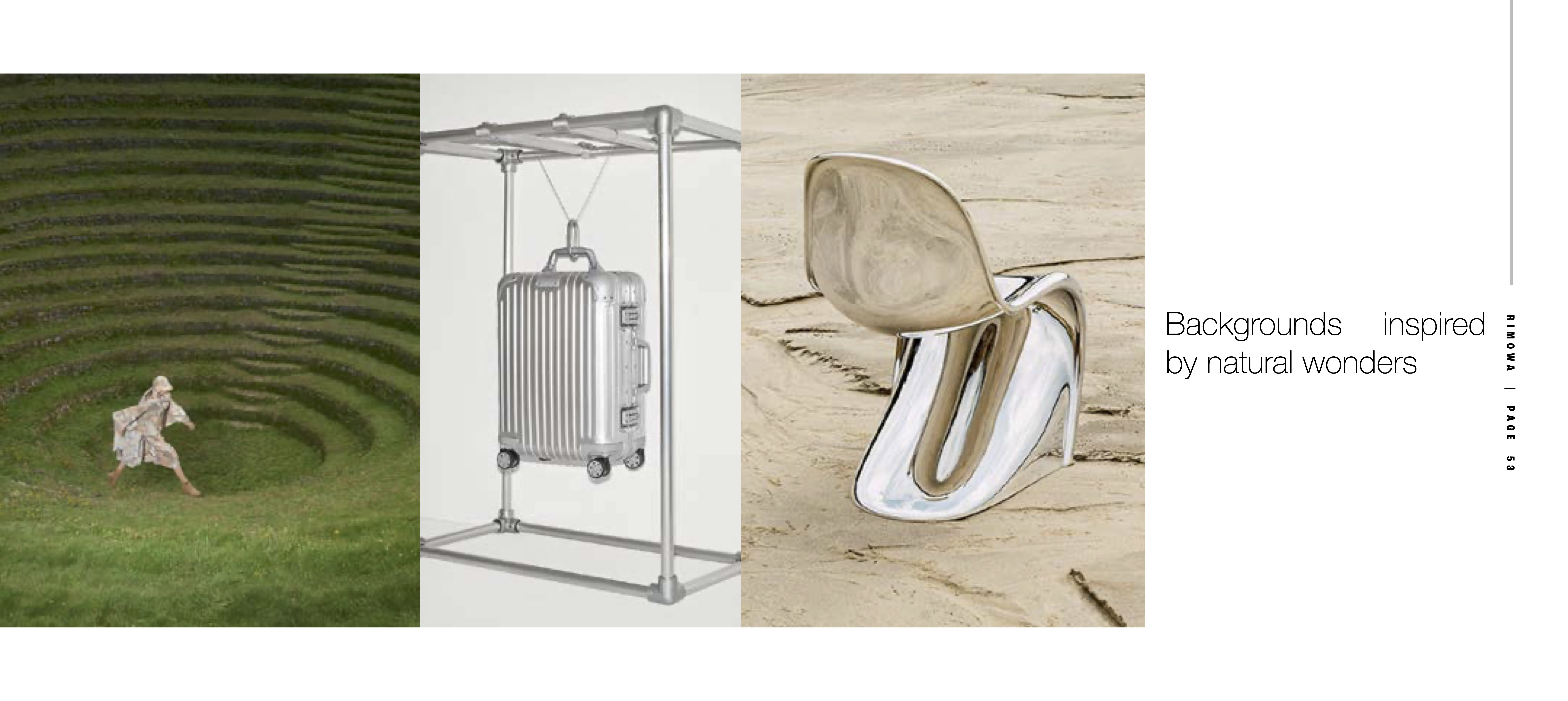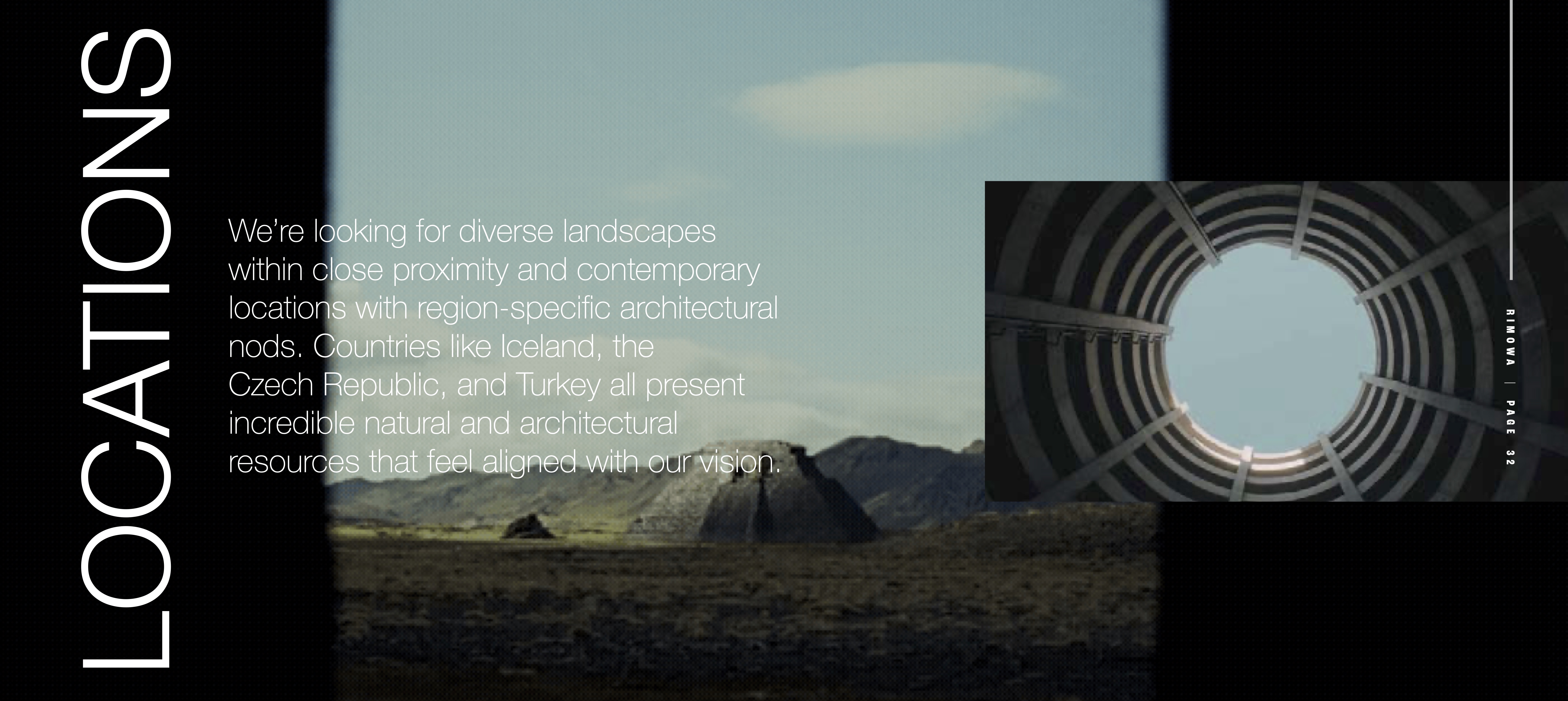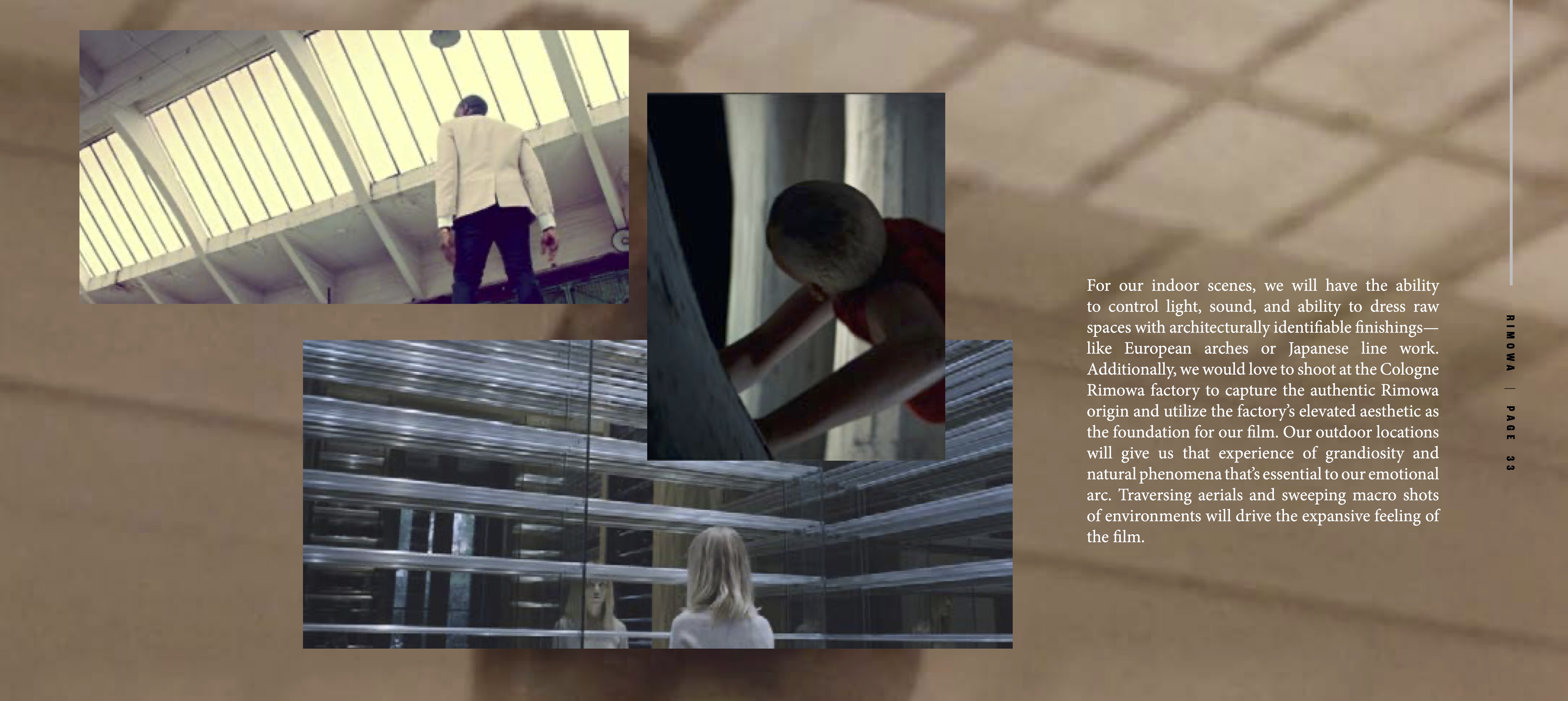 For our indoor scenes, we will have the ability to control light, sound, and ability to dress raw spaces with architecturally identifiable finishings—like European arches or Japanese line work. Additionally, we would love to shoot at the Cologne Rimowa factory to capture the authentic Rimowa origin and utilize the factory’s elevated aesthetic as the foundation for our film. Our outdoor locations will give us that experience of grandiosity and natural phenomena that’s essential to our emotional arc. Traversing aerials and sweeping macro shots of environments will drive the expansive feeling of the film.