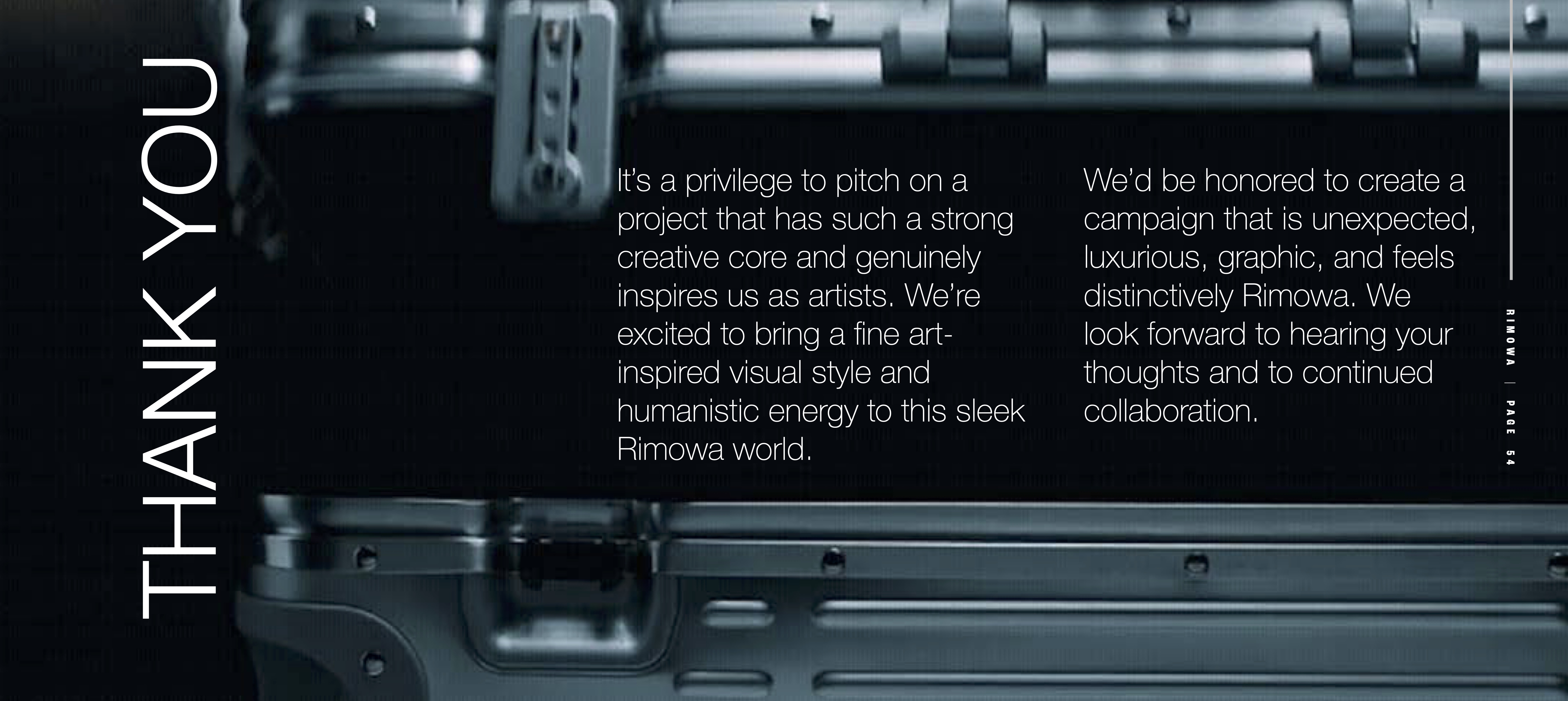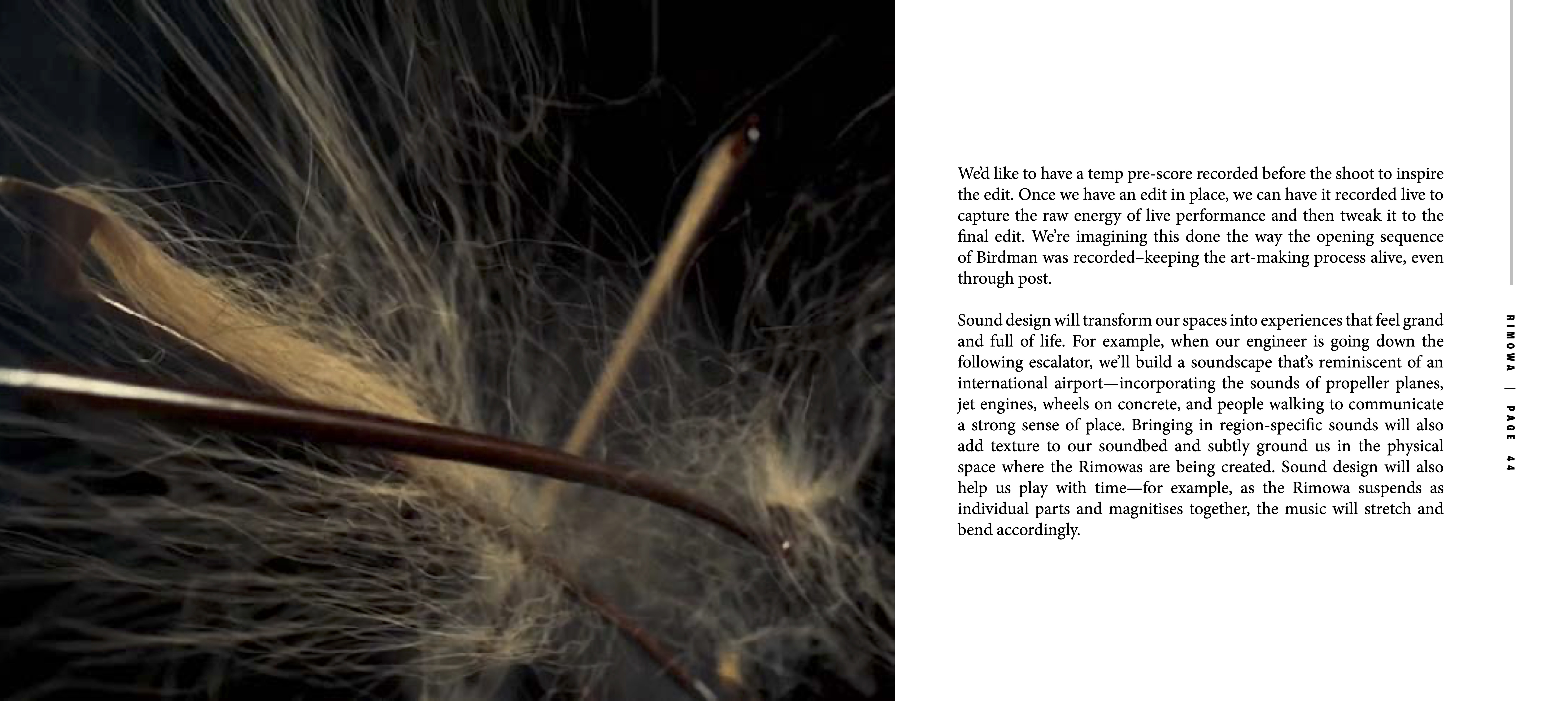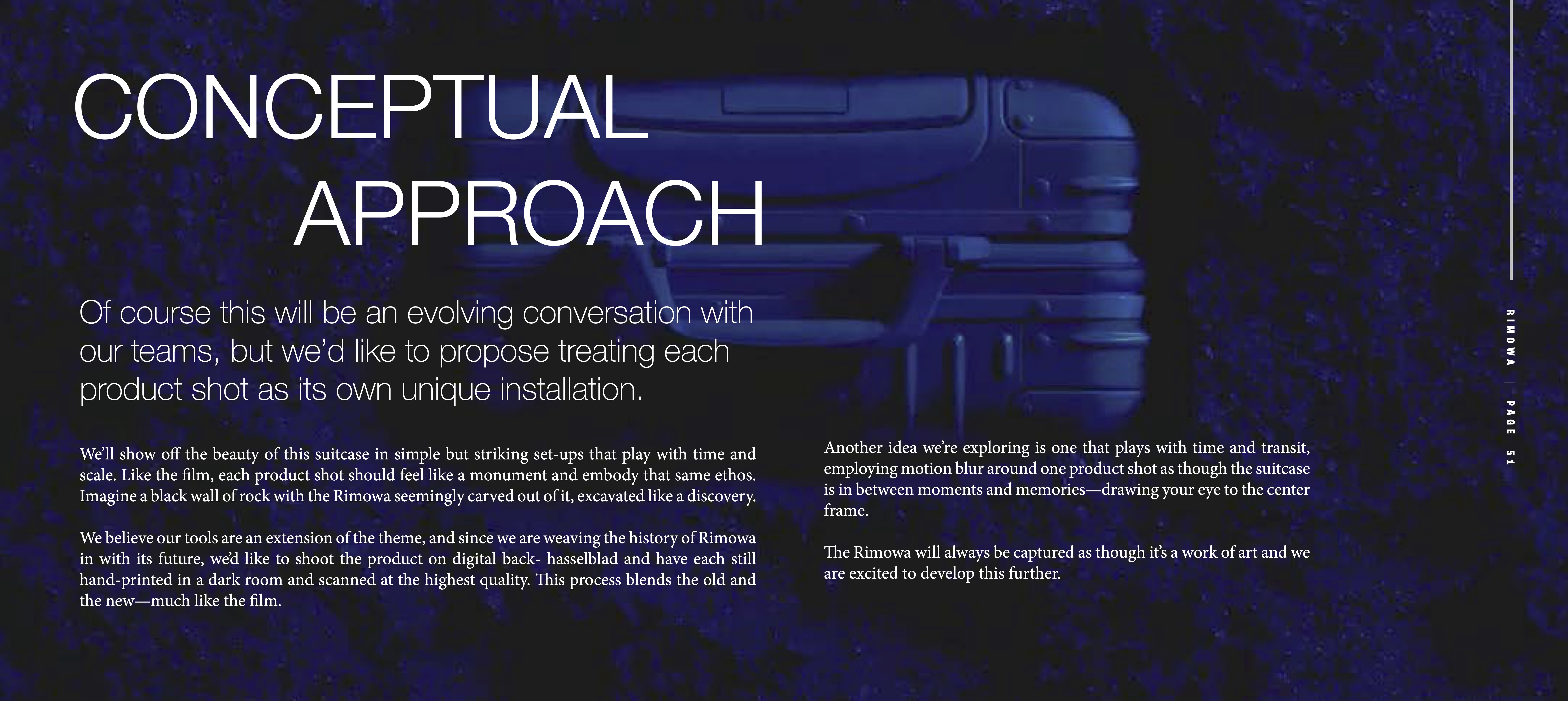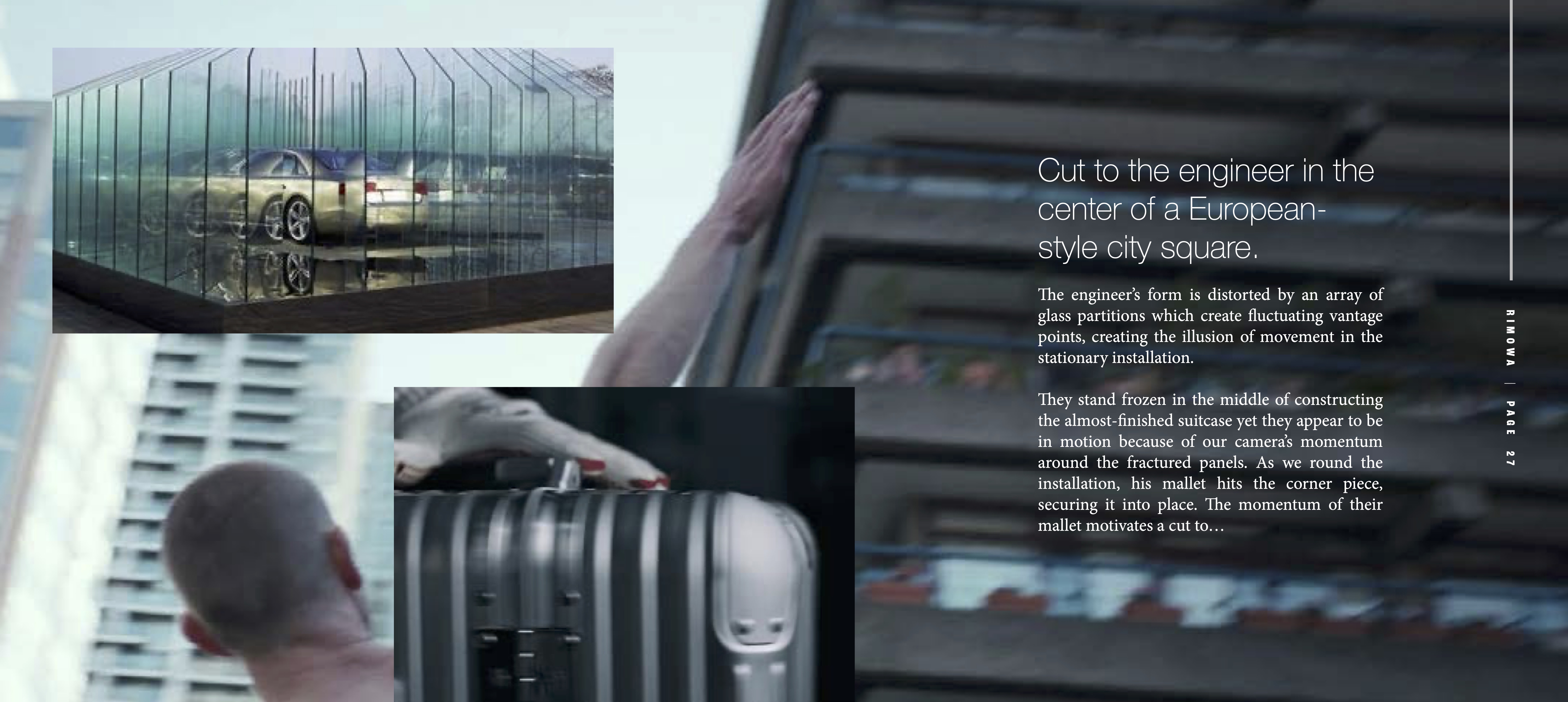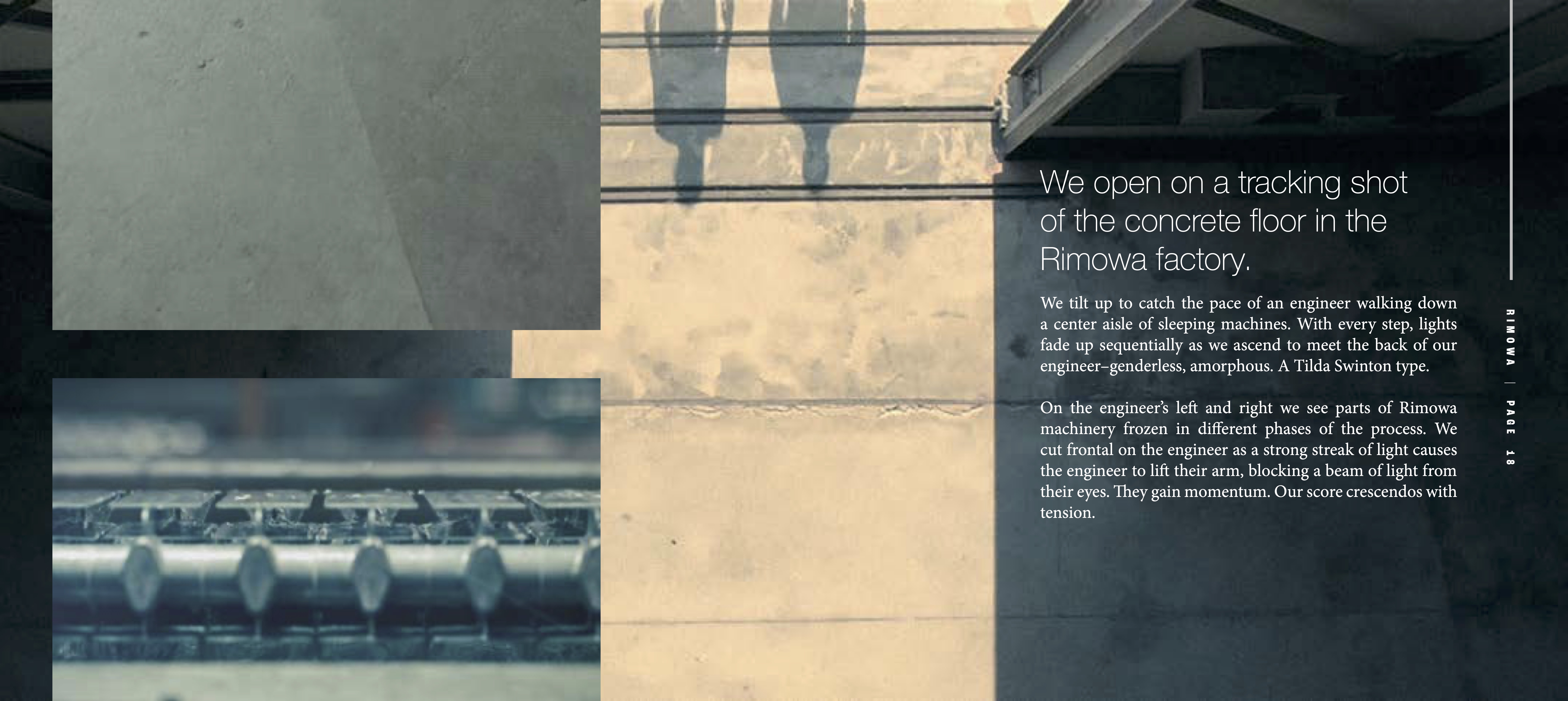 For our indoor scenes, we will have the ability to control light, sound, and ability to dress raw spaces with architecturally identifiable finishings—like European arches or Japanese line work. Additionally, we would love to shoot at the Cologne Rimowa factory to capture the authentic Rimowa origin and utilize the factory’s elevated aesthetic as the foundation for our film. Our outdoor locations will give us that experience of grandiosity and natural phenomena that’s essential to our emotional arc. Traversing aerials and sweeping macro shots of environments will drive the expansive feeling of the film.