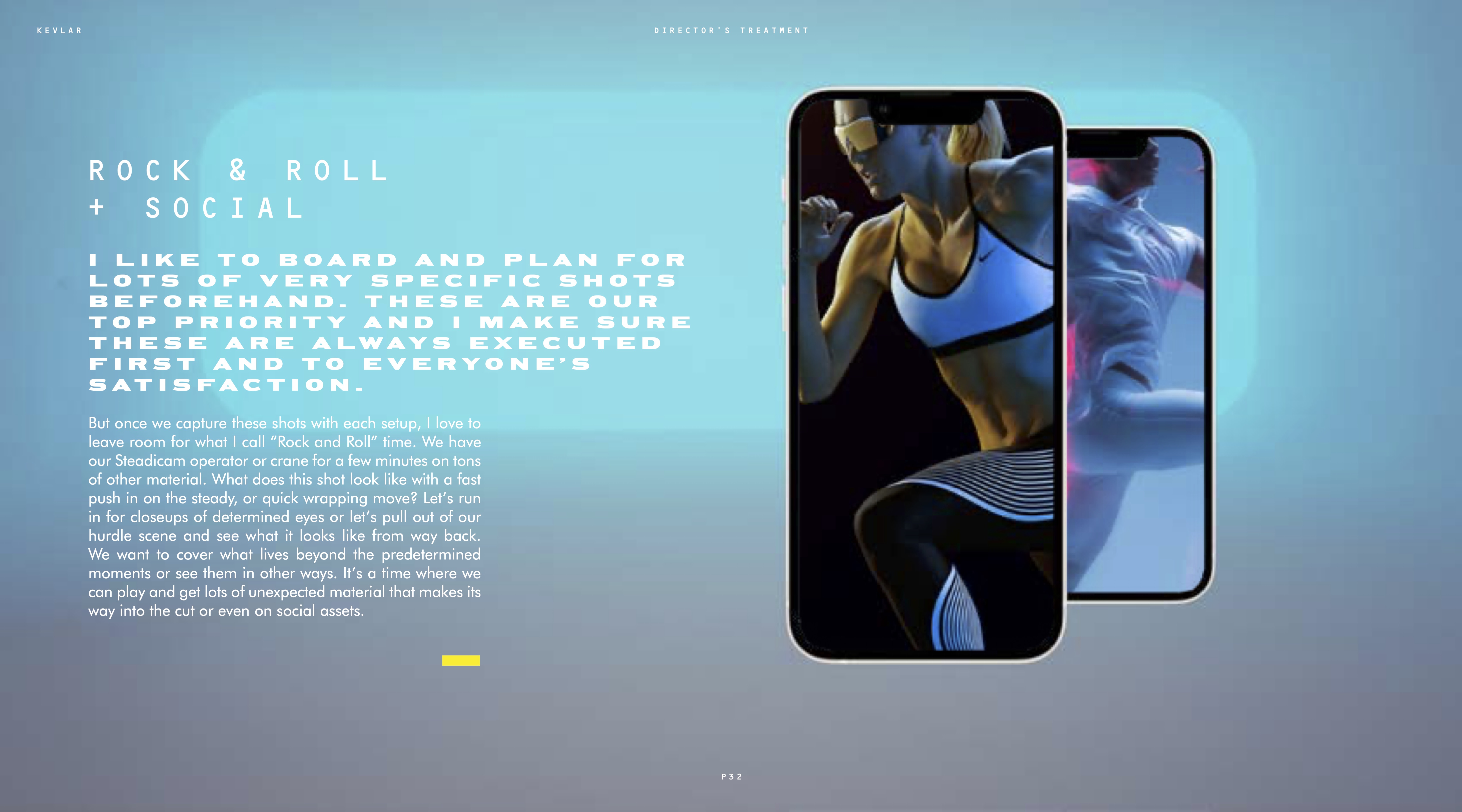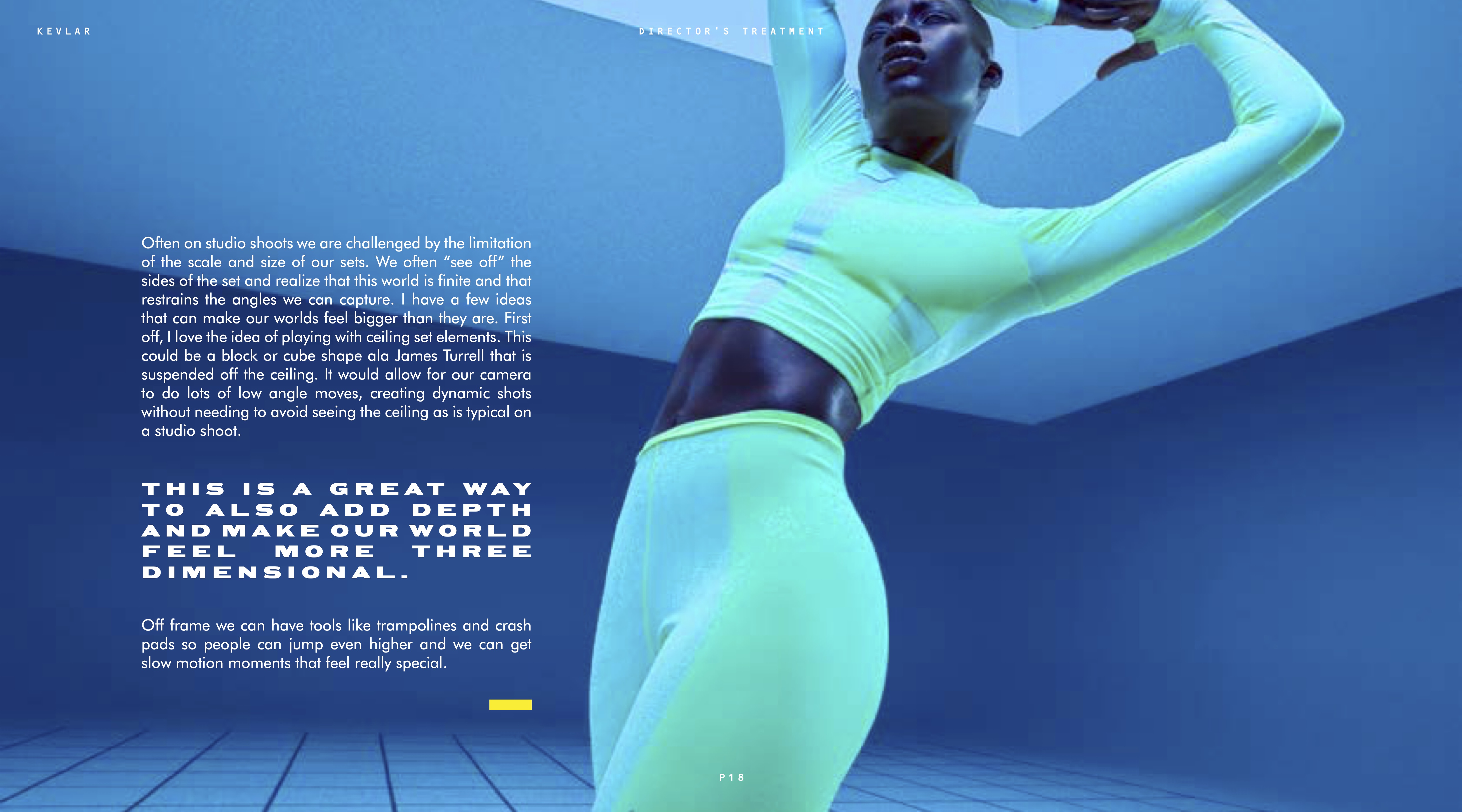 Our coverage of it should always emphasize its uncompromising flexibility, durability, and comfort. We want to see it in constant motion—jumping, sprinting, stretching, twisting—illustrating how seamlessly it melds and moves with the body. We’ll use tech mesh dots to emphasize the details of the vest’s versatility and highlight the vest as the center of every shot. It would be amazing to design a white version of the vest for our shoot so we can play with reflection of the colored lights, enhancing our visual language and also bringing further emphasis to the vest itself and making it feel like a true star.